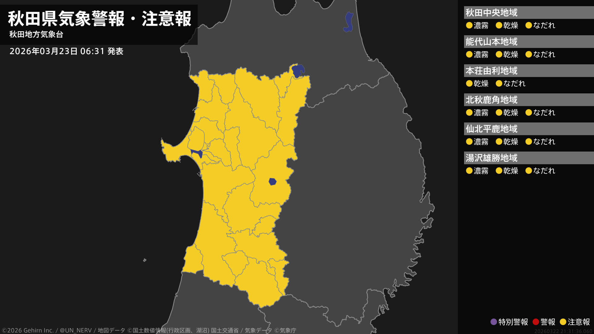 【秋田県 気象警報・注意報 2026年03月23日 06:31】秋田県では、23日昼前まで濃霧による視程障害に、23日まで空気の乾燥した状態が続くため、火の取り扱いに、ここしばらくなだれに注意してください。#気象警報注意報 #秋田県