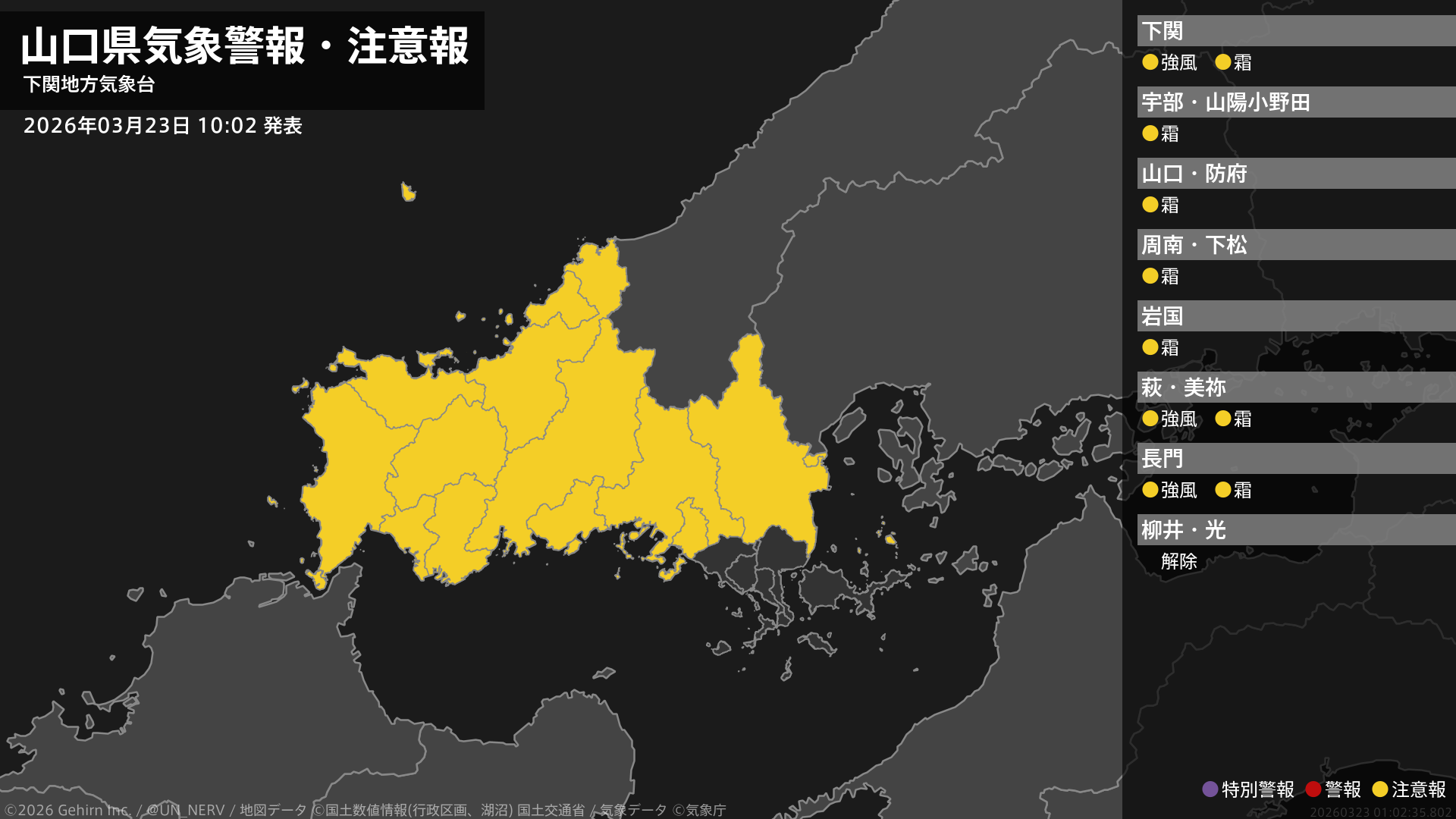 【山口県 気象警報・注意報 2026年03月23日 10:02】西部、北部では、24日明け方まで強風に注意してください。山口県では、24日朝は霜に対する農作物の管理に注意してください。#気象警報注意報 #山口県