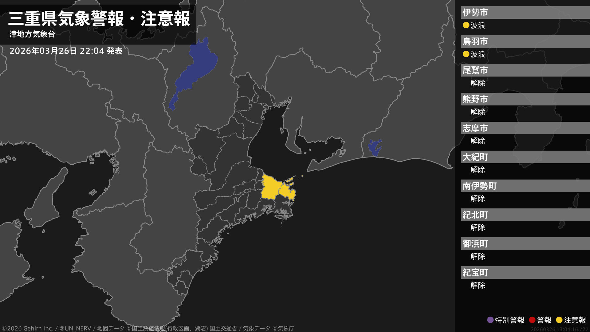 【三重県 気象警報・注意報 2026年03月26日 22:04】
