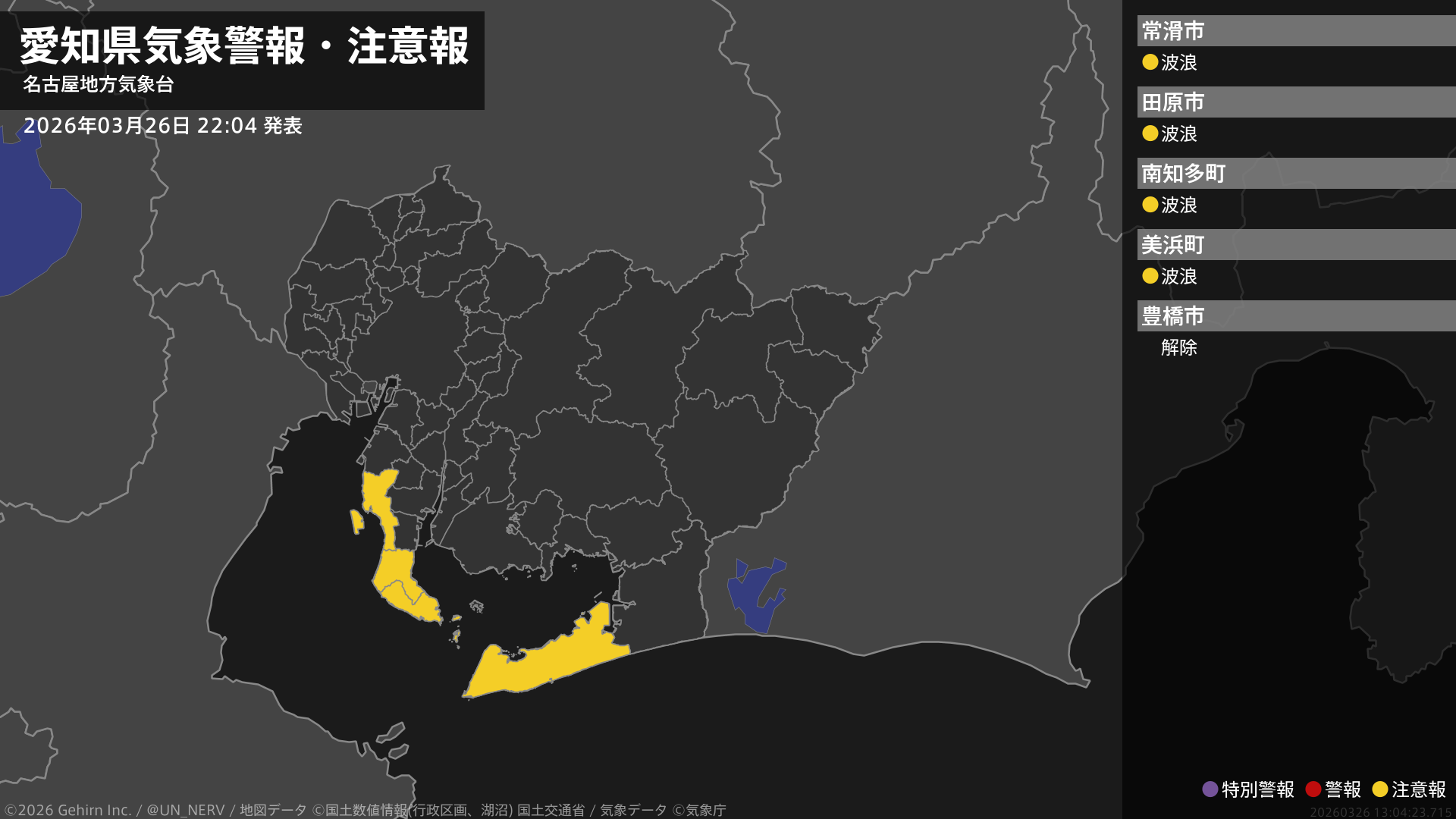 【愛知県 気象警報・注意報 2026年03月26日 22:04】