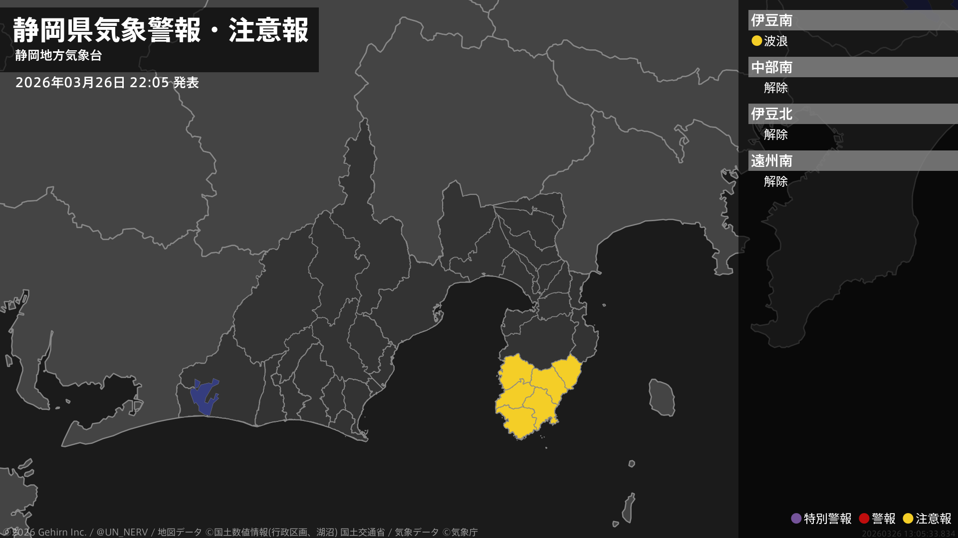【静岡県 気象警報・注意報 2026年03月26日 22:05】