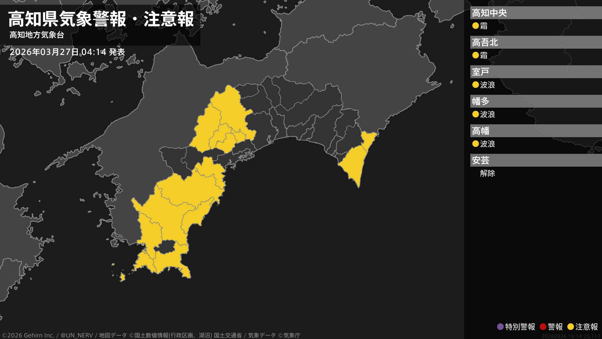 【高知県 気象警報・注意報 2026年03月27日 04:14】東部、西部では、27日昼前まで高波に注意してください。中部では、27日朝は霜に対する農作物の管理に注意してください。#気象警報注意報 #高知県