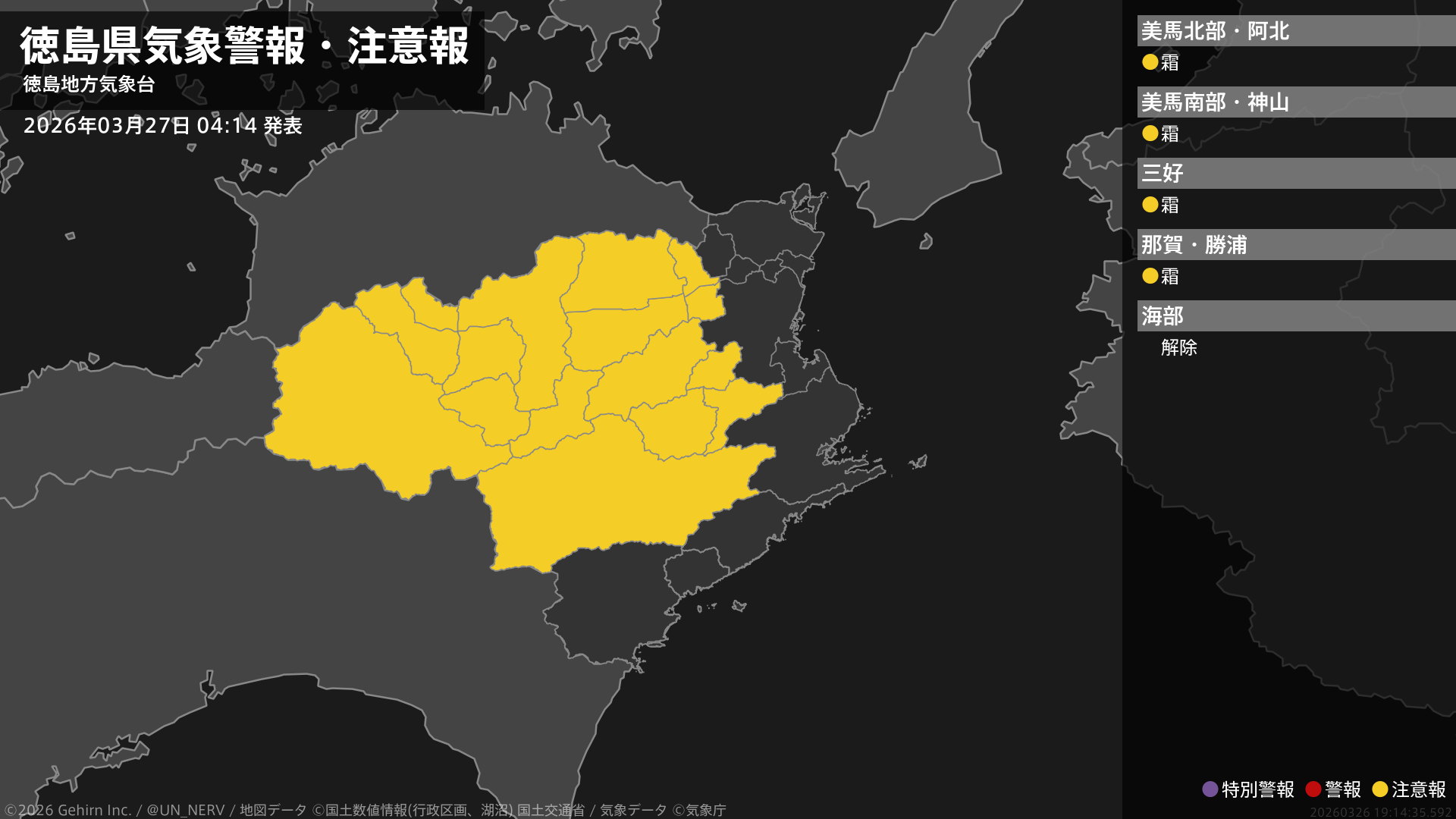 【徳島県 気象警報・注意報 2026年03月27日 04:14】徳島県では、27日朝は霜に対する農作物の管理に注意してください。#気象警報注意報 #徳島県