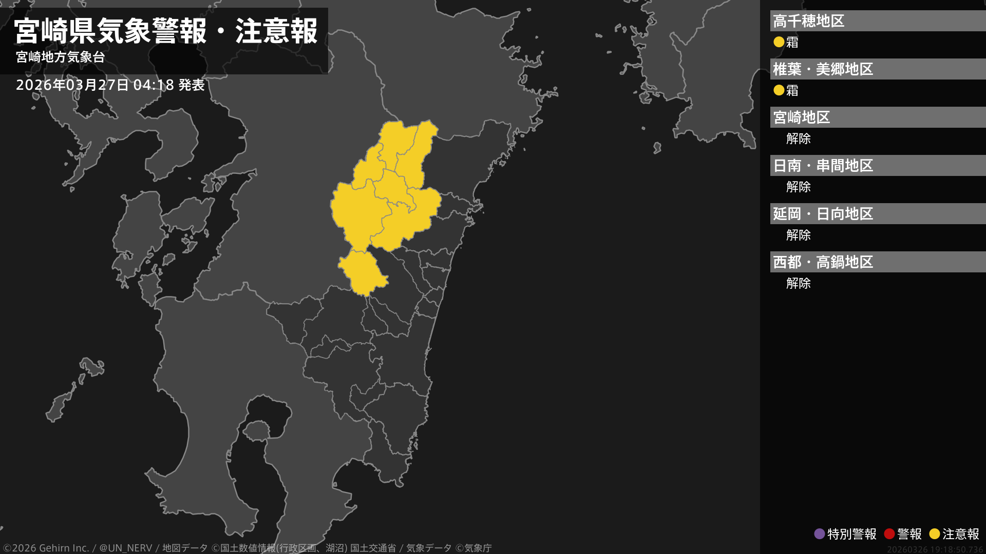 【宮崎県 気象警報・注意報 2026年03月27日 04:18】北部山沿いでは、27日朝は霜に対する農作物の管理に注意してください。#気象警報注意報 #宮崎県