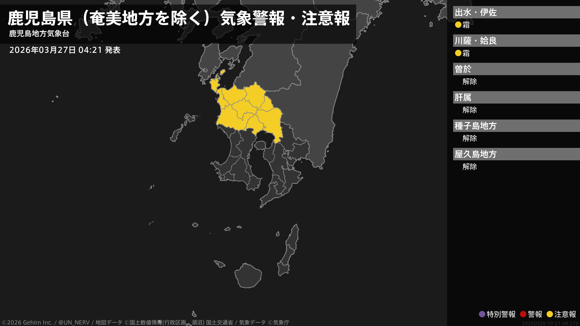 【鹿児島県(奄美地方を除く) 気象警報・注意報 2026年03月27日 04:21】薩摩地方では、27日朝は霜に対する農作物の管理に注意してください。#気象警報注意報 #鹿児島県(奄美地方除く)