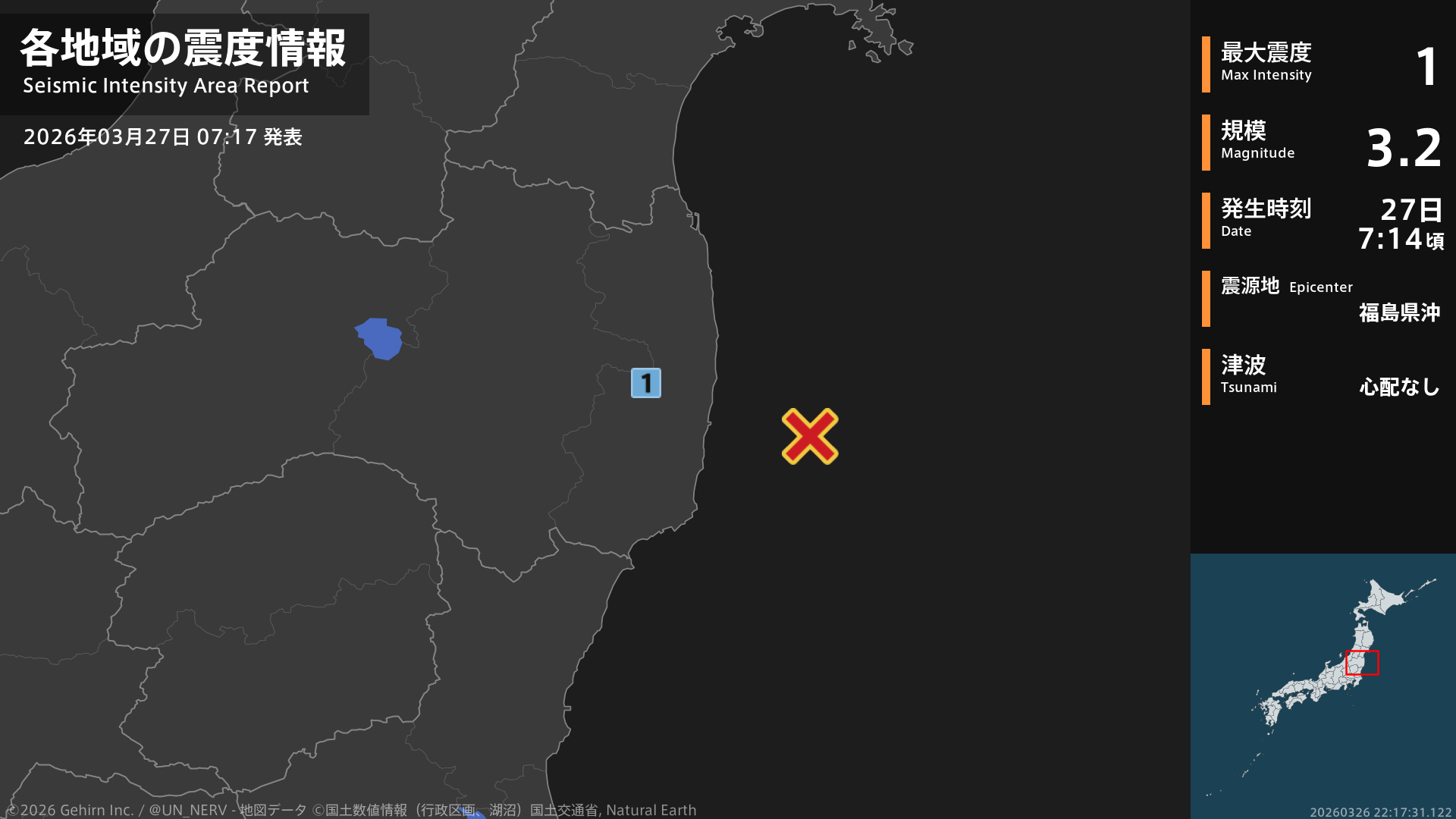 7時14分頃、福島県沖を震源とする地震がありました。震源の深さは約30km、地震の規模はM3.2、最大震度1を福島県で観測しています。この地震による津波の心配はありません。
