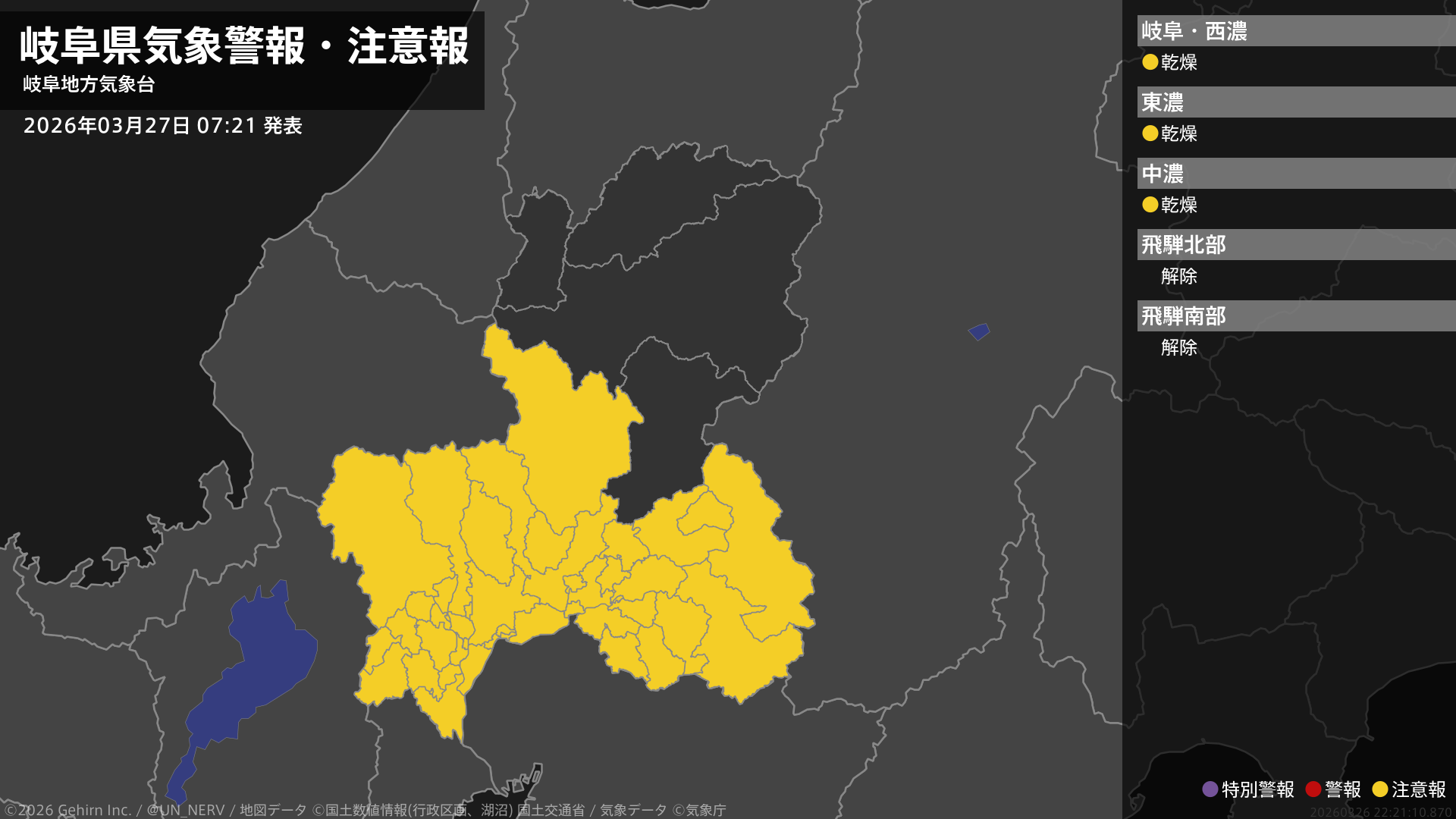 【岐阜県 気象警報・注意報 2026年03月27日 07:21】