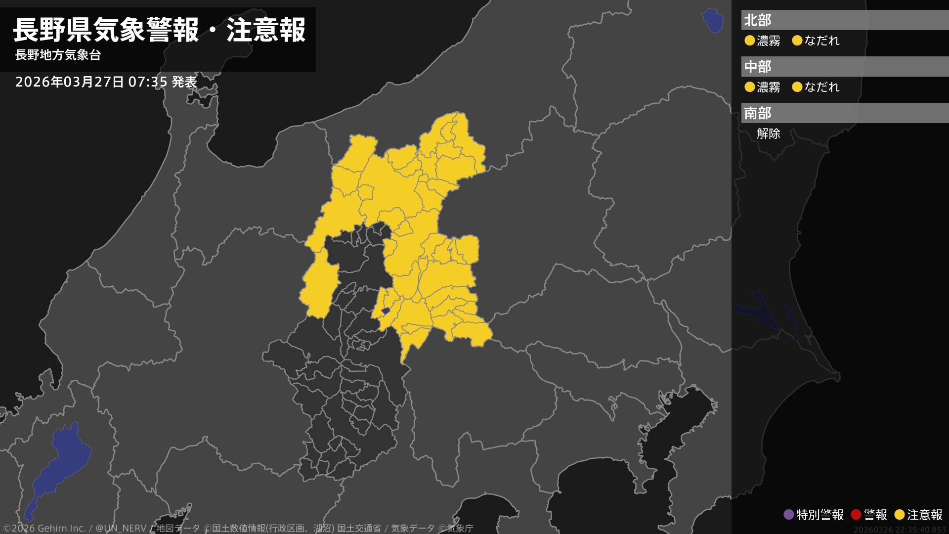 【長野県 気象警報・注意報 2026年03月27日 07:35】