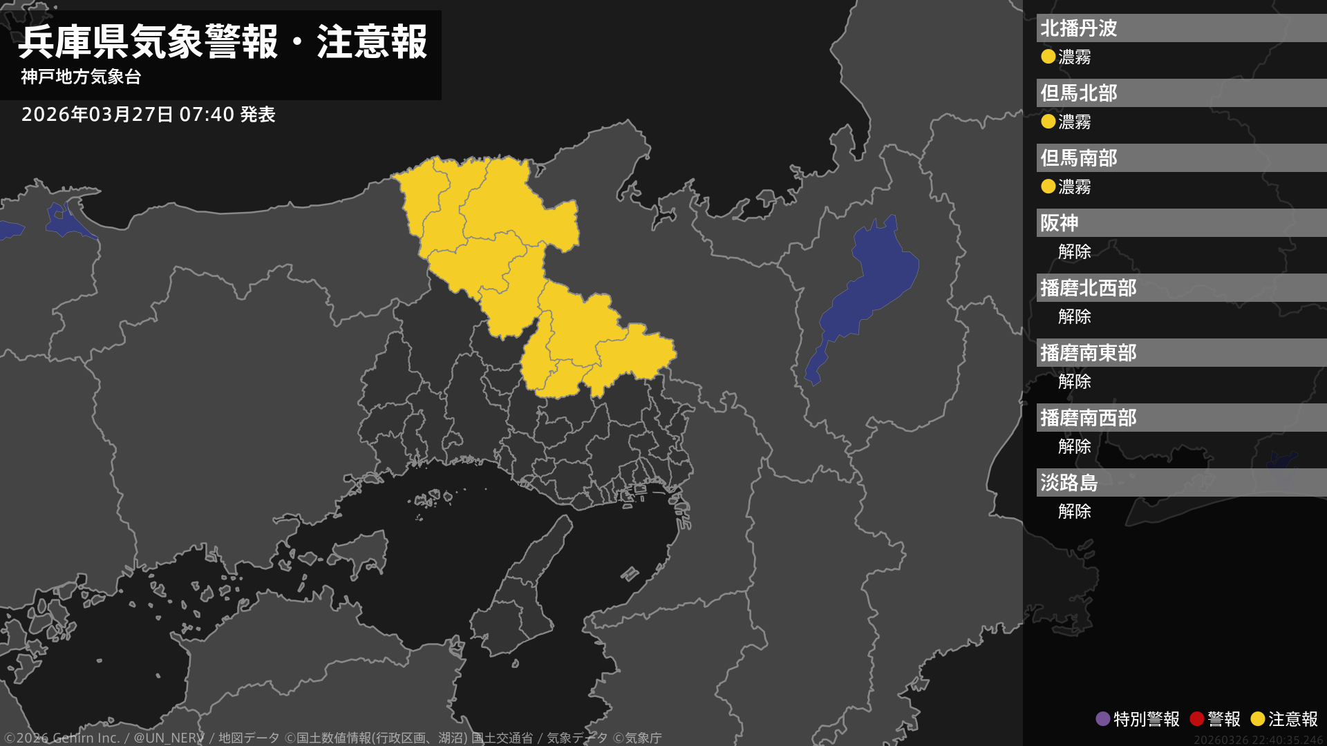 【兵庫県 気象警報・注意報 2026年03月27日 07:40】