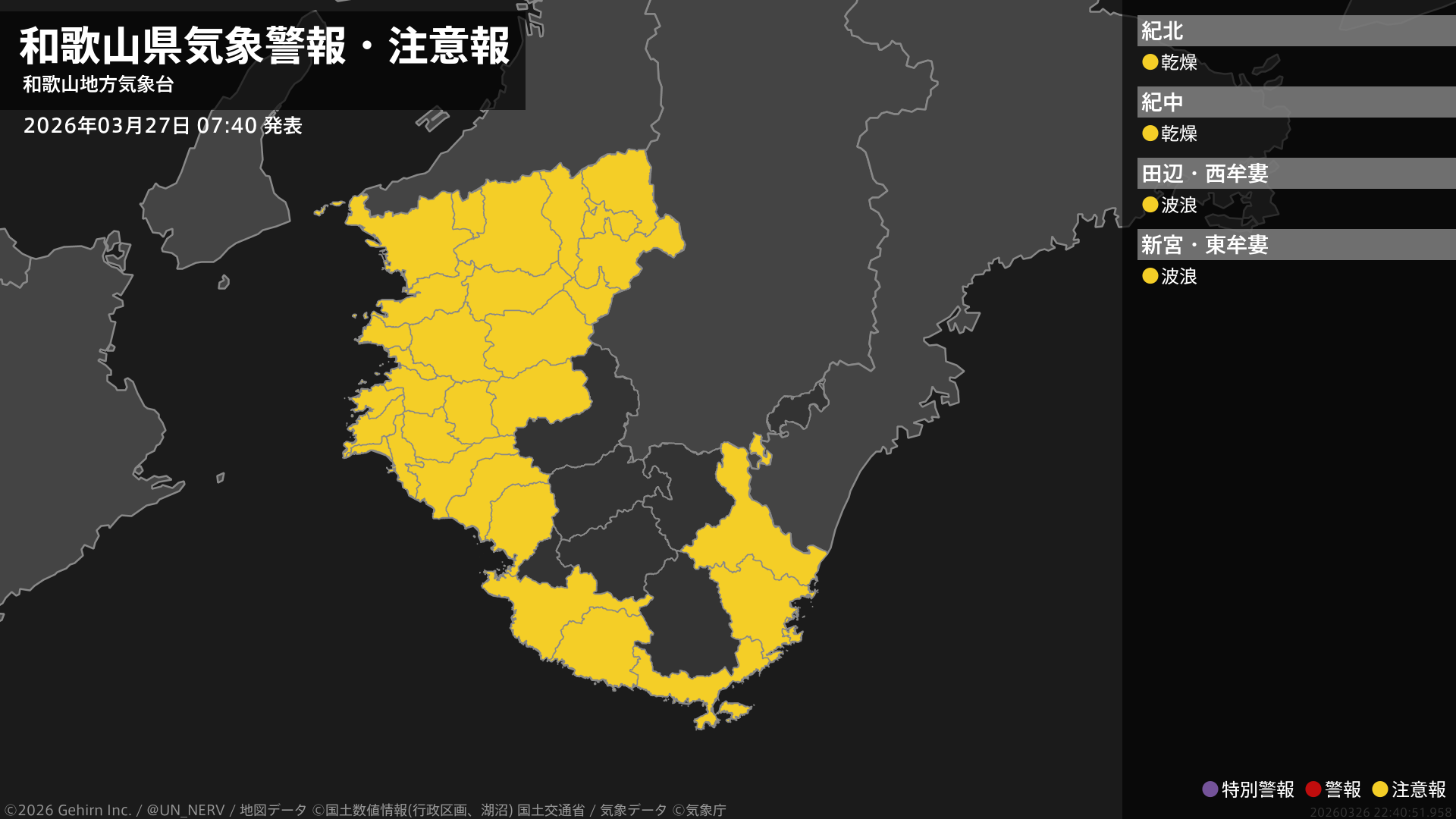 【和歌山県 気象警報・注意報 2026年03月27日 07:40】