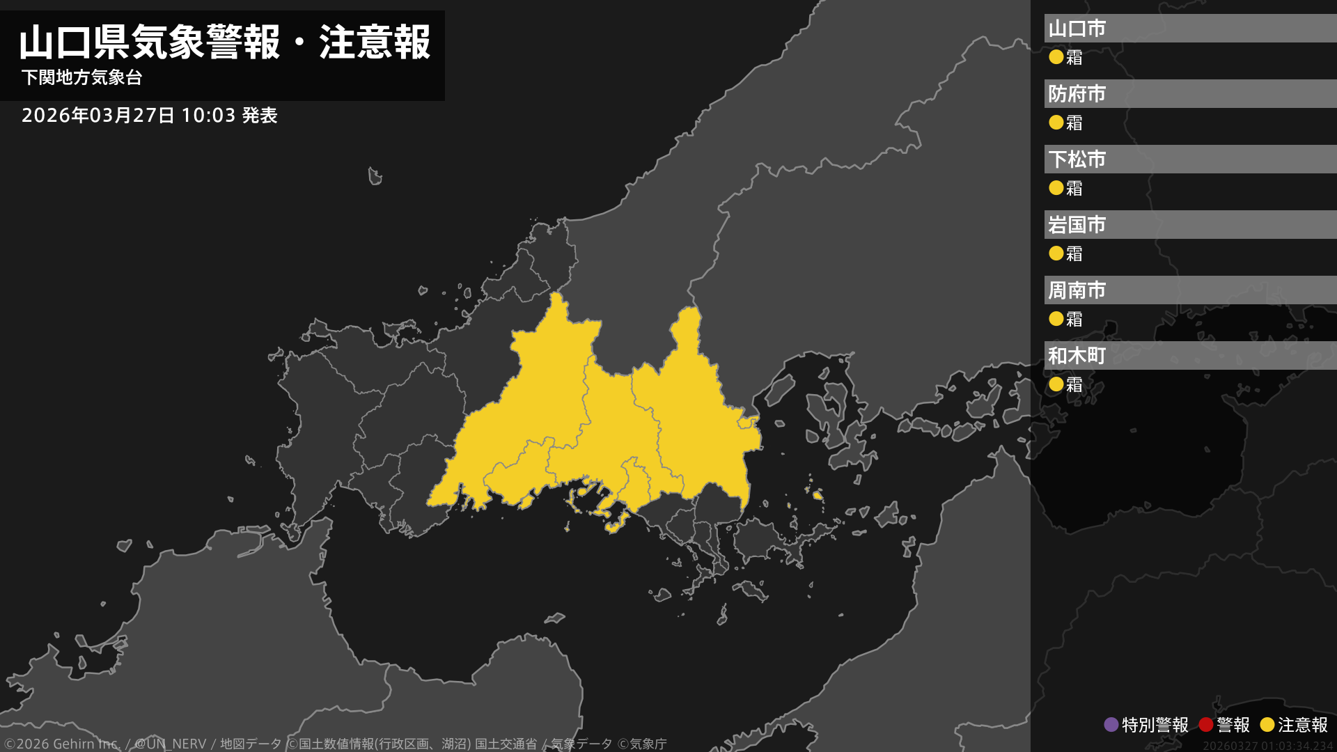 【山口県 気象警報・注意報 2026年03月27日 10:03】中部、東部では、28日朝は霜に対する農作物の管理に注意してください。#気象警報注意報 #山口県