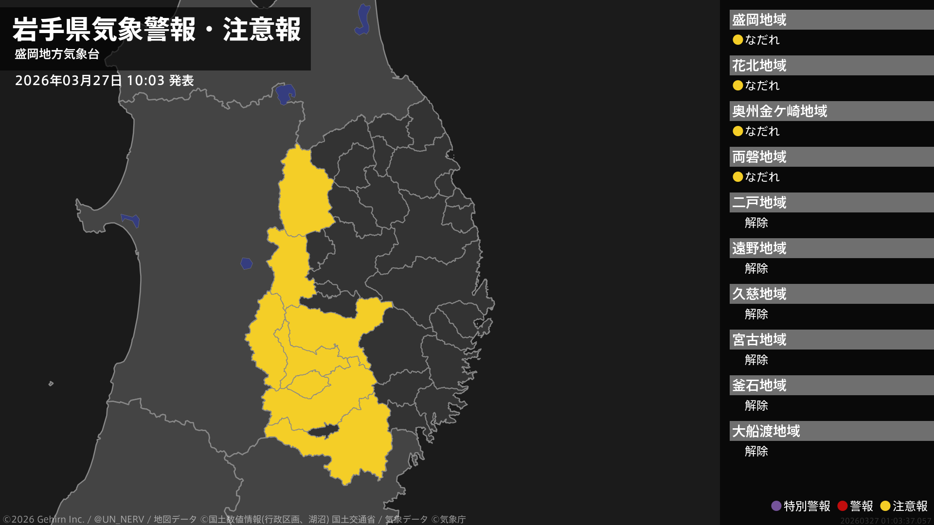 【岩手県 気象警報・注意報 2026年03月27日 10:03】内陸では、ここしばらくなだれに注意してください。#気象警報注意報 #岩手県