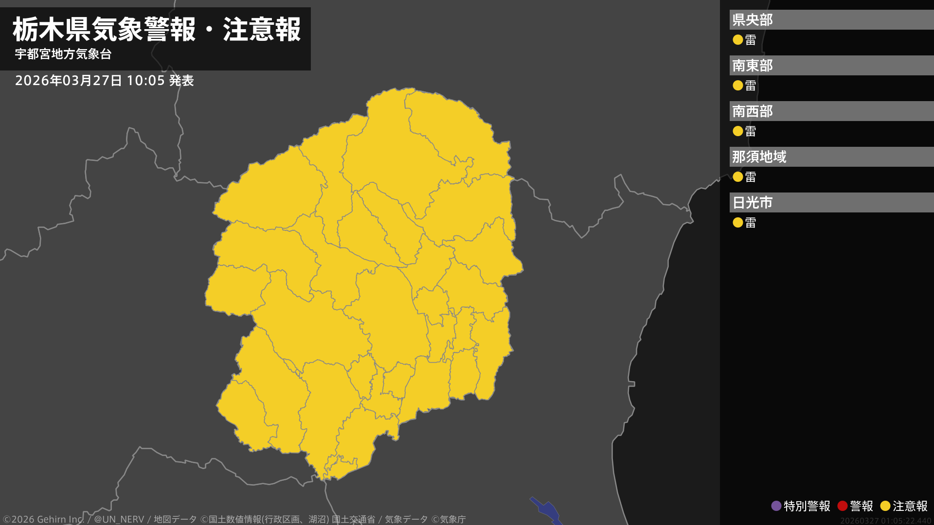 【栃木県 気象警報・注意報 2026年03月27日 10:05】栃木県では、27日昼過ぎから27日夜遅くまで急な強い雨や落雷に注意してください。#気象警報注意報 #栃木県
