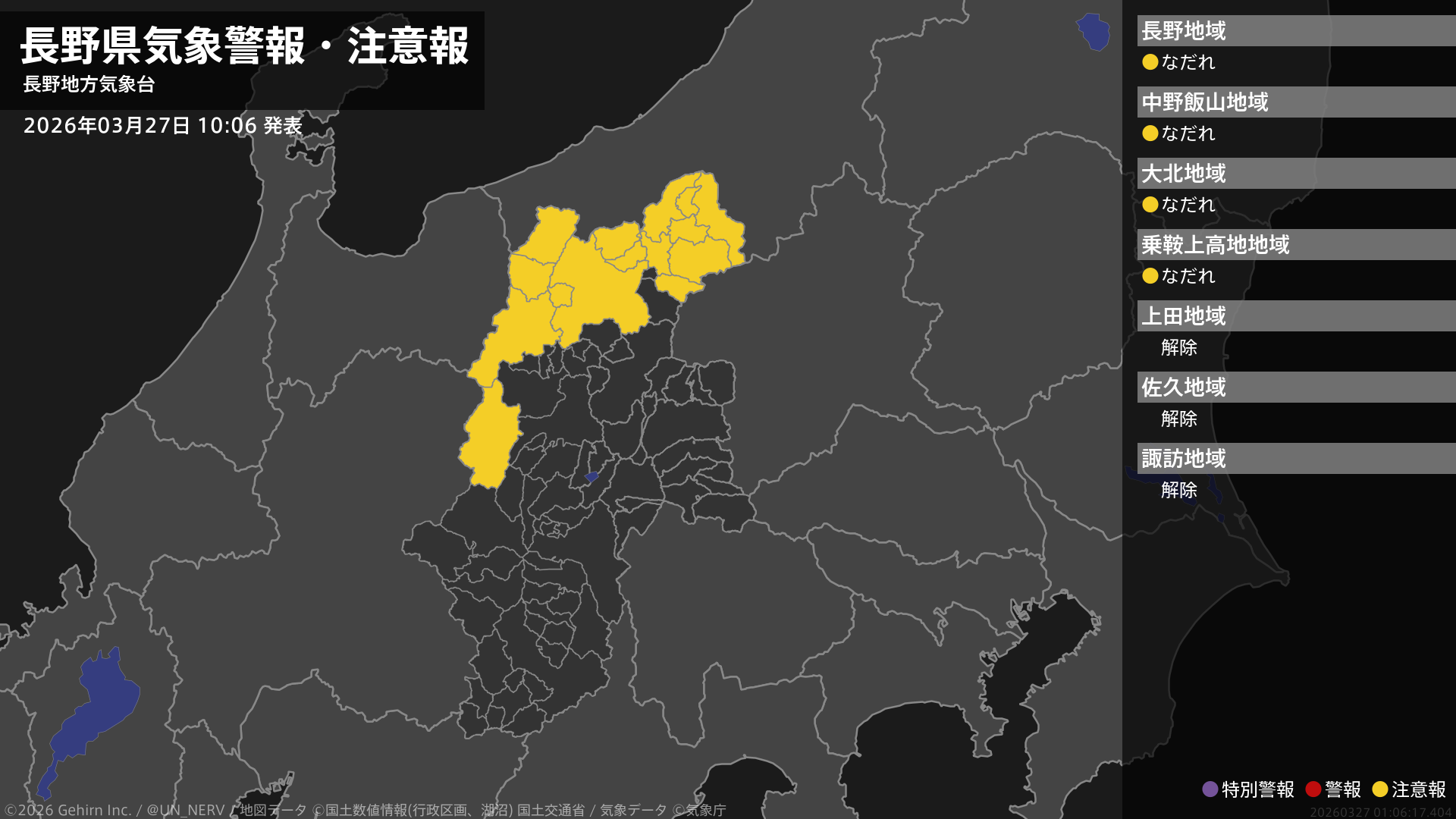 【長野県 気象警報・注意報 2026年03月27日 10:06】北部、中部では、28日までなだれに注意してください。#気象警報注意報 #長野県