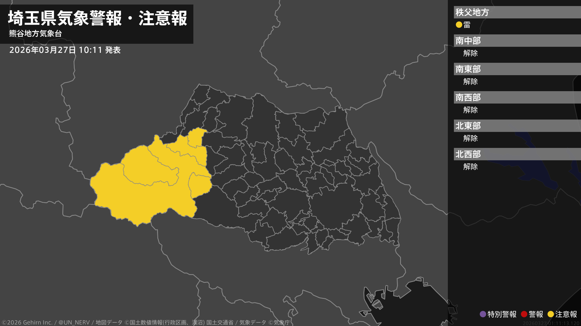 【埼玉県 気象警報・注意報 2026年03月27日 10:11】秩父地方では、27日夕方から27日夜遅くまで急な強い雨や落雷に注意してください。#気象警報注意報 #埼玉県
