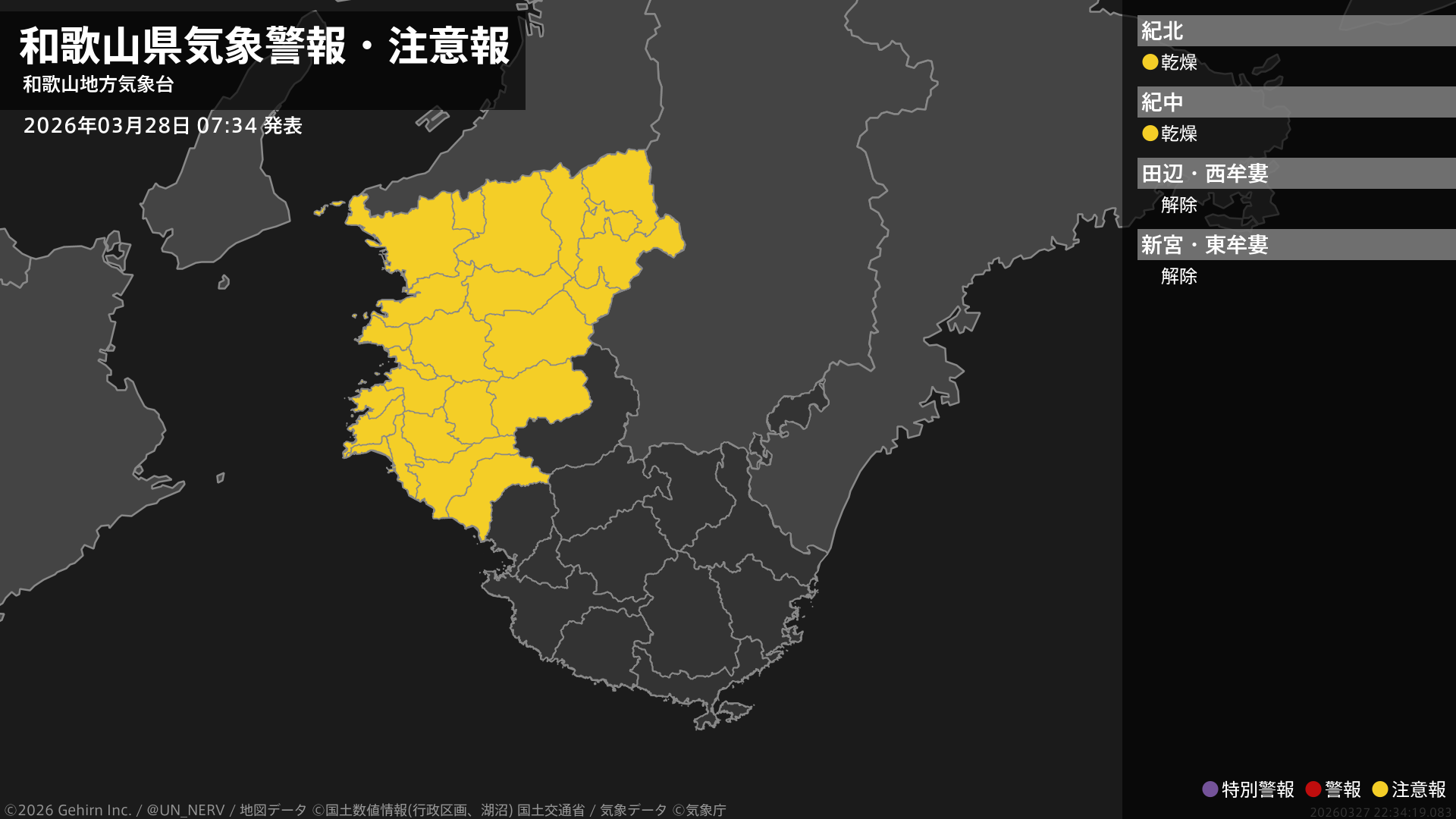 【和歌山県 気象警報・注意報 2026年03月28日 07:34】