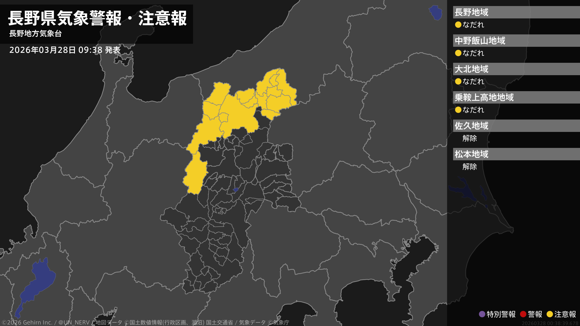 【長野県 気象警報・注意報 2026年03月28日 09:38】