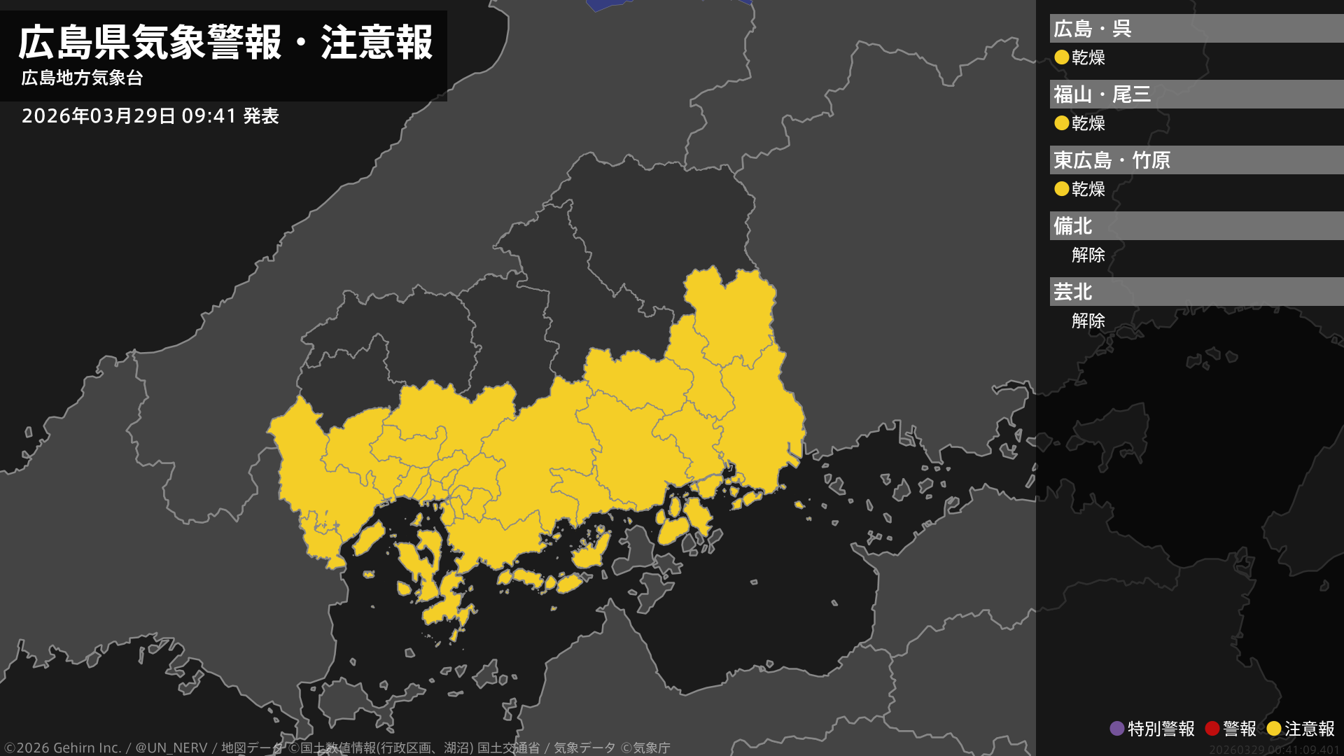 【広島県 気象警報・注意報 2026年03月29日 09:41】南部では、30日まで空気の乾燥した状態が続くため、火の取り扱いに注意してください。#気象警報注意報 #広島県