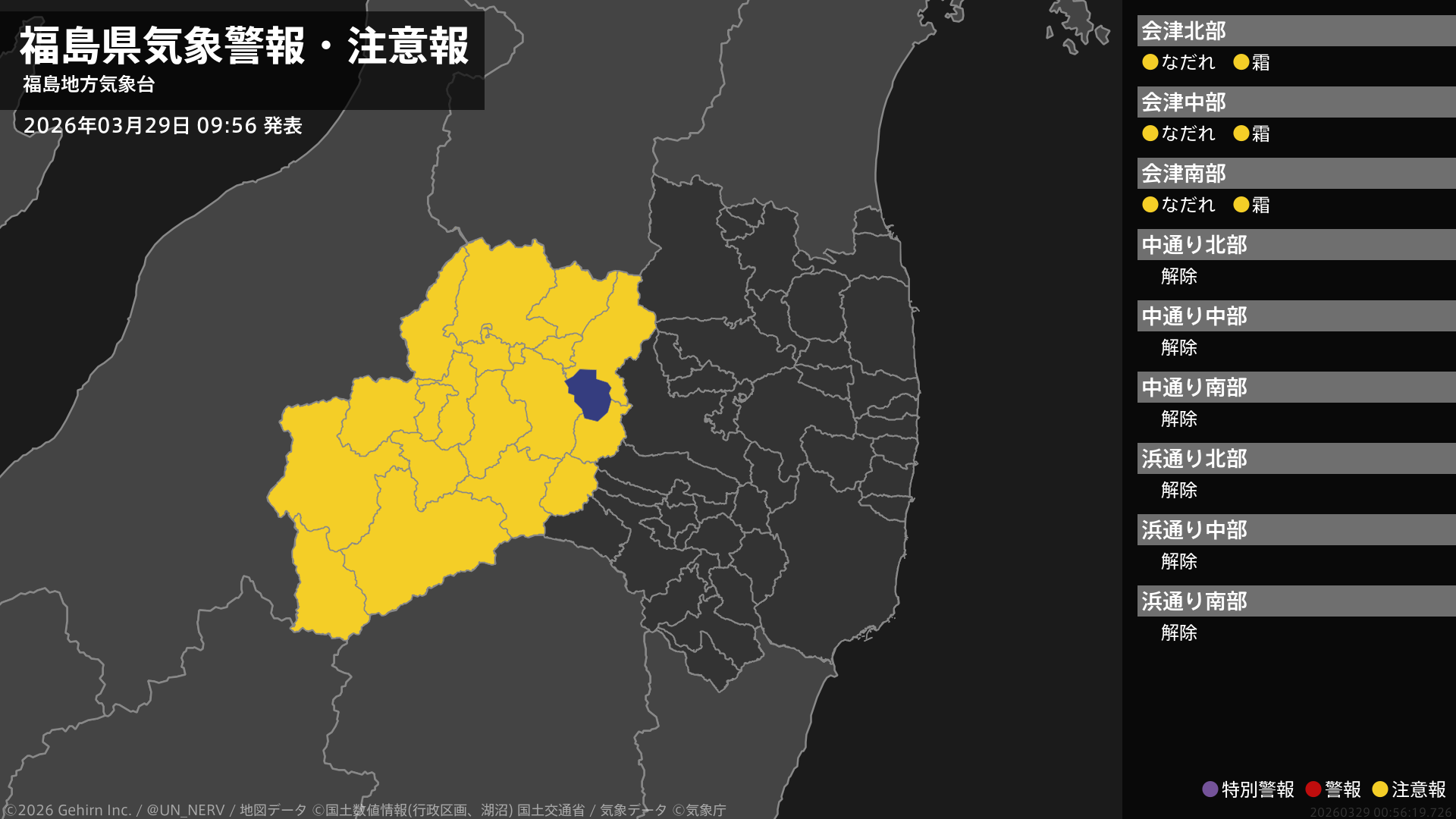 【福島県 気象警報・注意報 2026年03月29日 09:56】会津では、ここしばらくなだれに、30日朝は霜に対する農作物の管理に注意してください。#気象警報注意報 #福島県