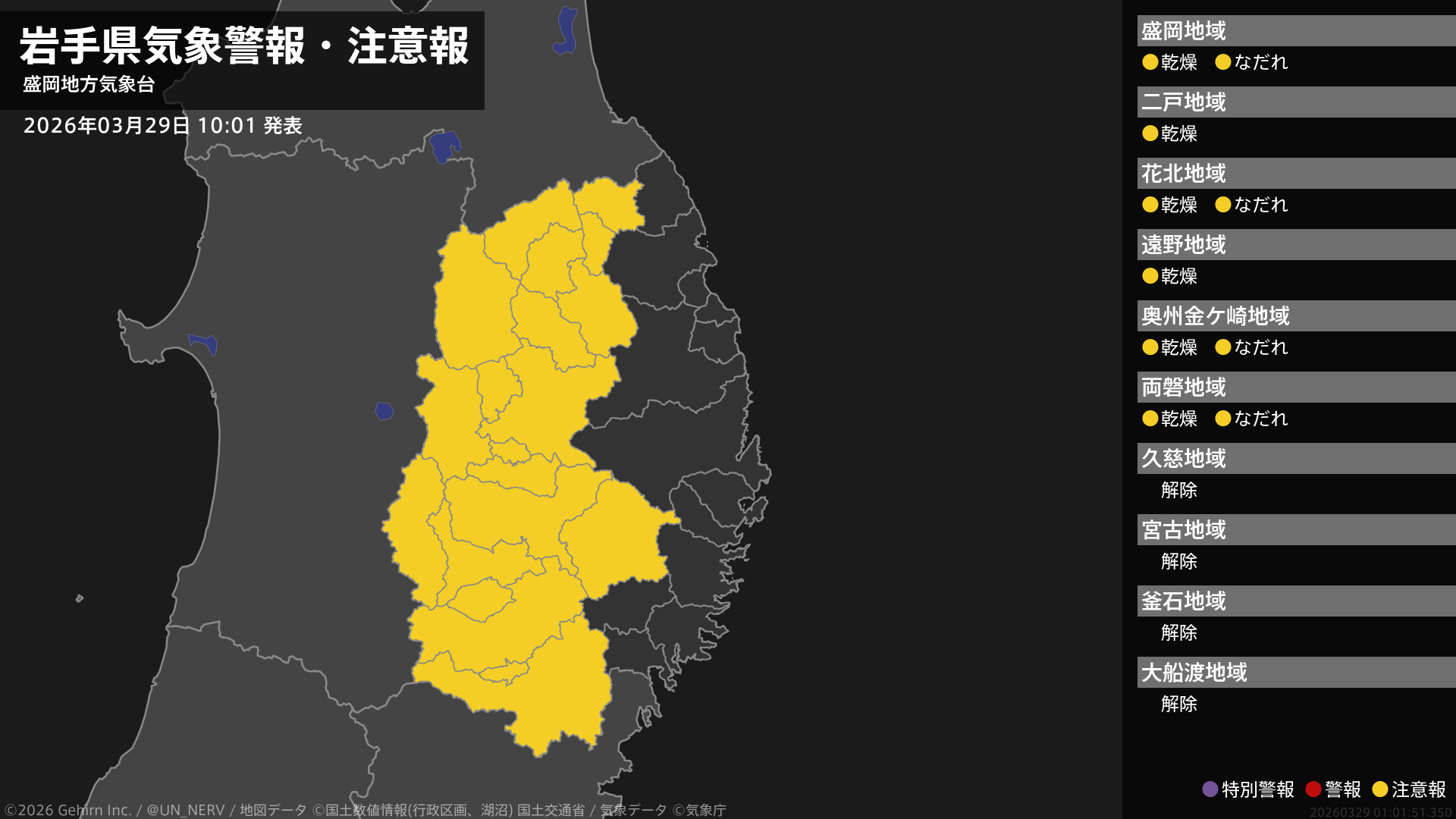 【岩手県 気象警報・注意報 2026年03月29日 10:01】内陸では、29日まで空気の乾燥した状態が続くため、火の取り扱いに、ここしばらくなだれに注意してください。#気象警報注意報 #岩手県