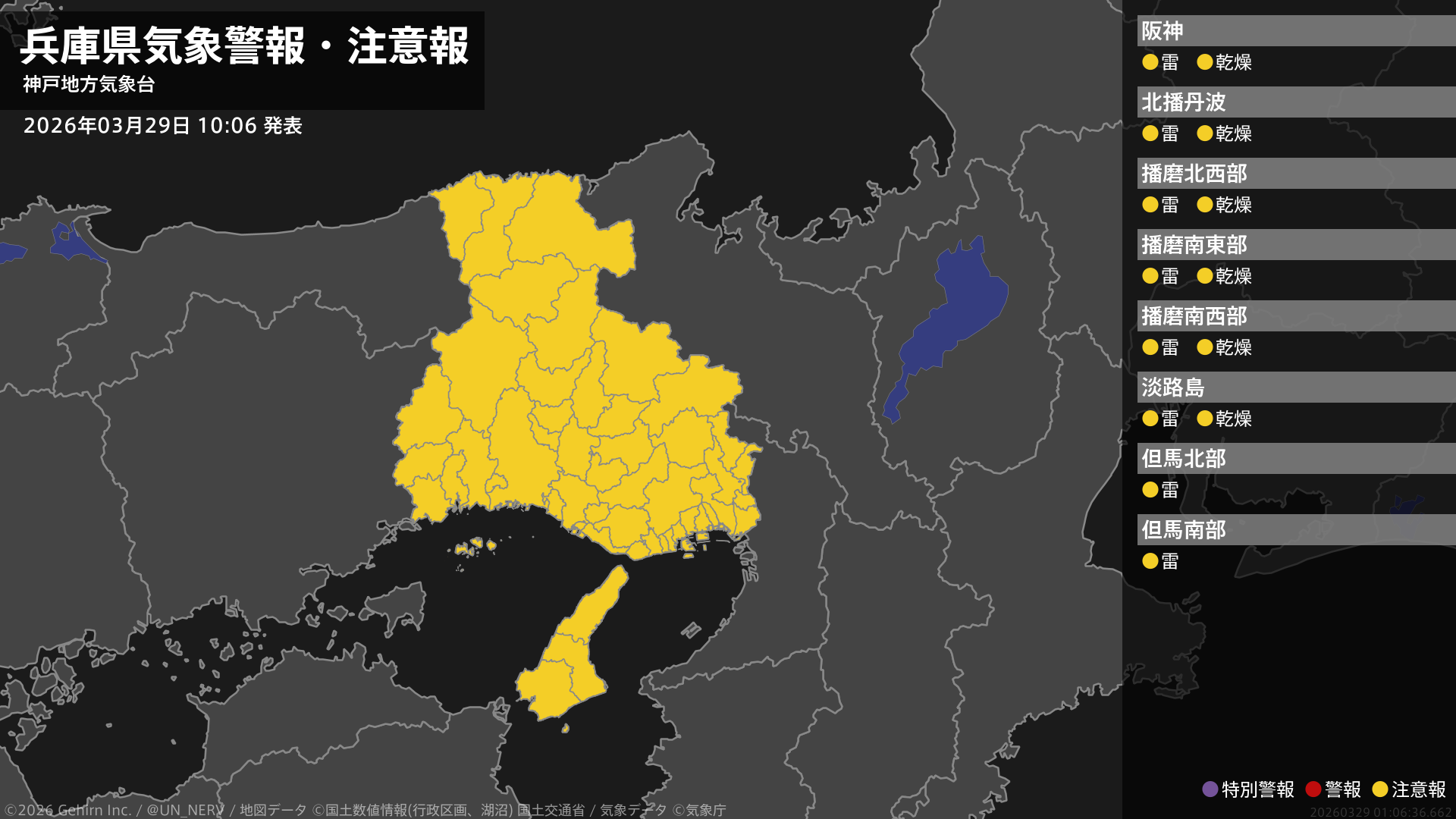 【兵庫県 気象警報・注意報 2026年03月29日 10:06】兵庫県では、29日夕方から30日明け方まで急な強い雨や落雷に注意してください。南部では、29日まで空気の乾燥した状態が続くため、火の取り扱いに注意してください。#気象警報注意報 #兵庫県