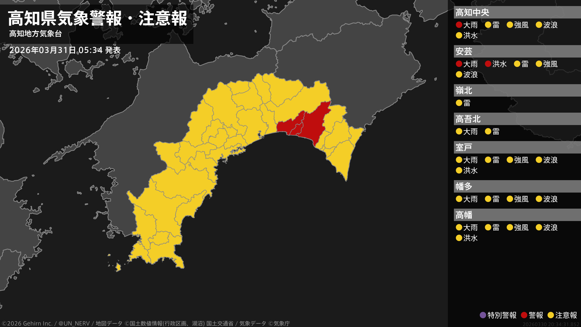 【高知県 気象警報・注意報 2026年03月31日 05:34】