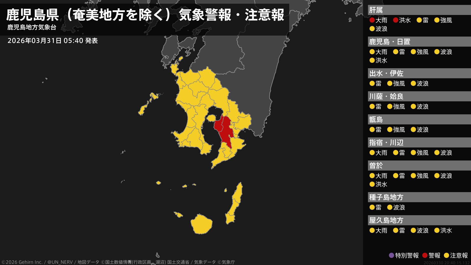 【鹿児島県(奄美地方を除く) 気象警報・注意報 2026年03月31日 05:40】