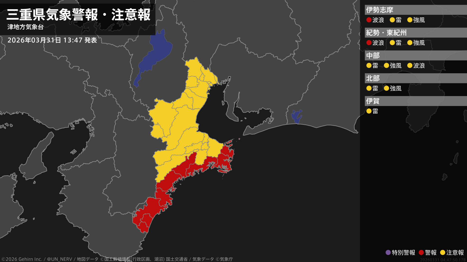 【三重県 気象警報・注意報 2026年03月31日 13:47】
