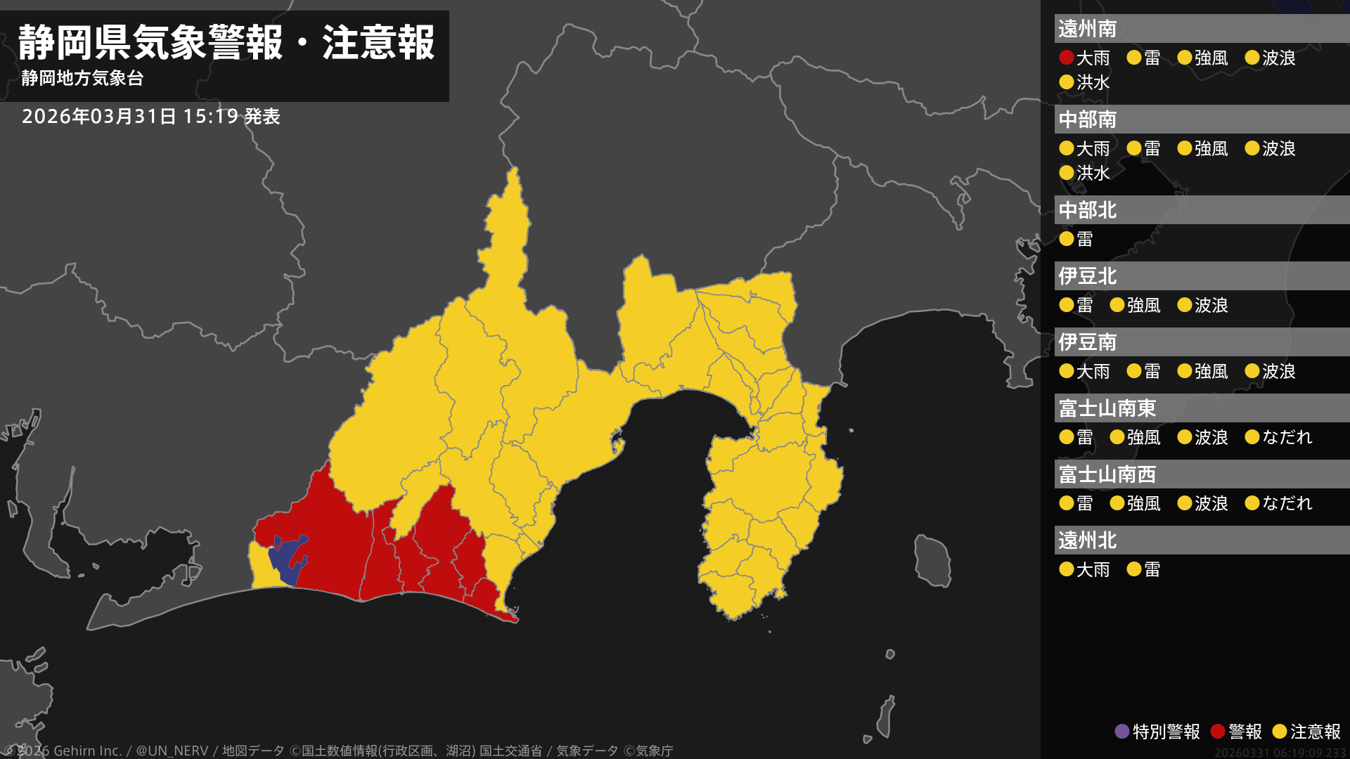 【静岡県 気象警報・注意報 2026年03月31日 15:19】