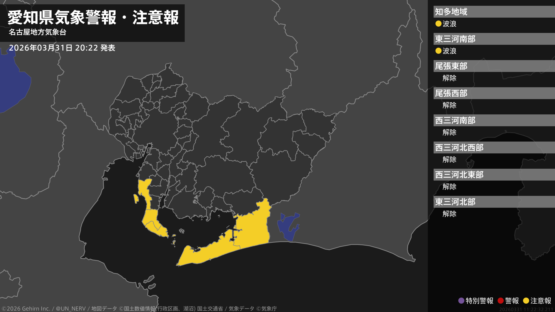 【愛知県 気象警報・注意報 2026年03月31日 20:22】