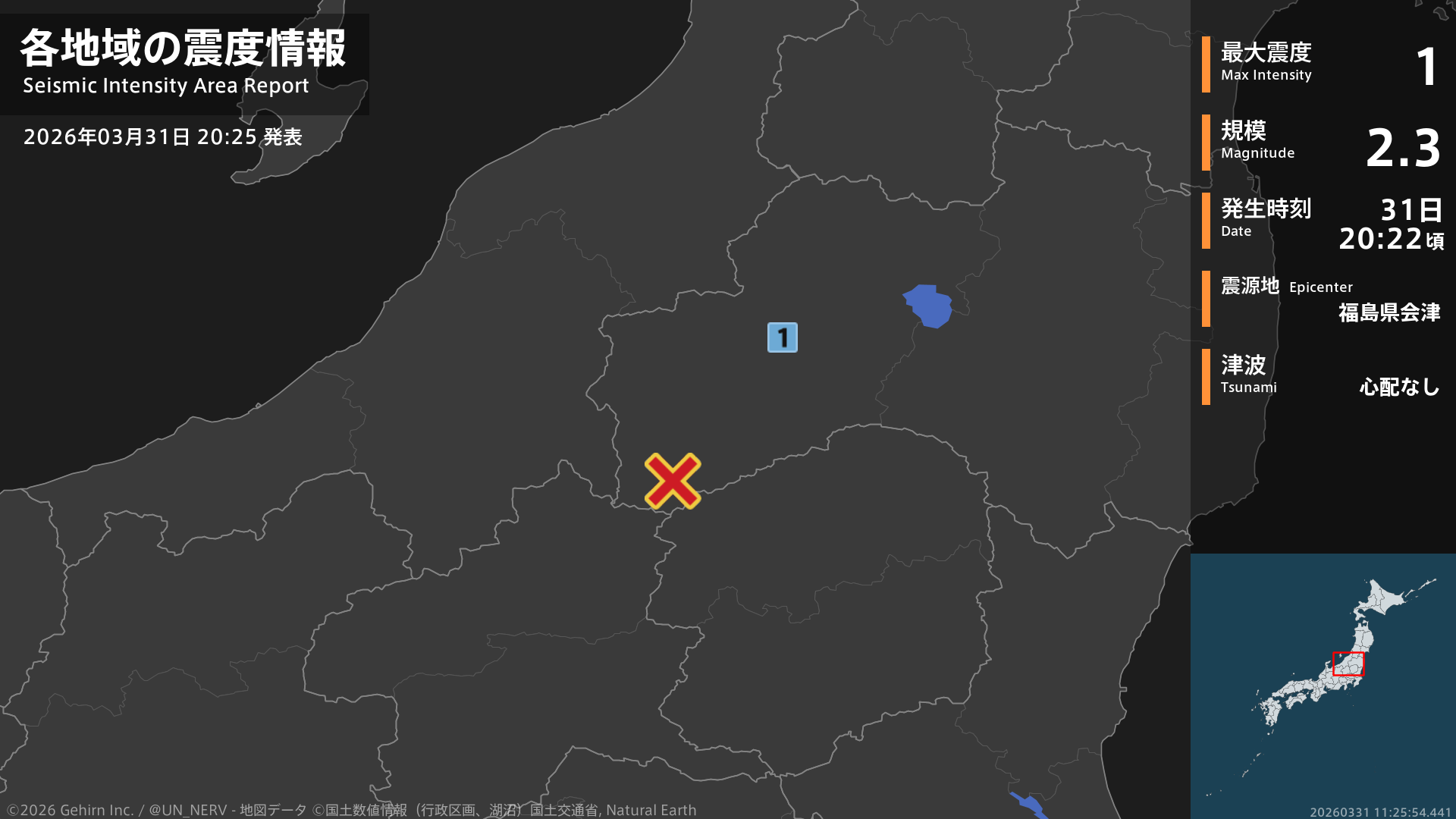 20時22分頃、福島県会津を震源とする地震がありました。震源の深さは約10km、地震の規模はM2.3、最大震度1を福島県で観測しています。この地震による津波の心配はありません。