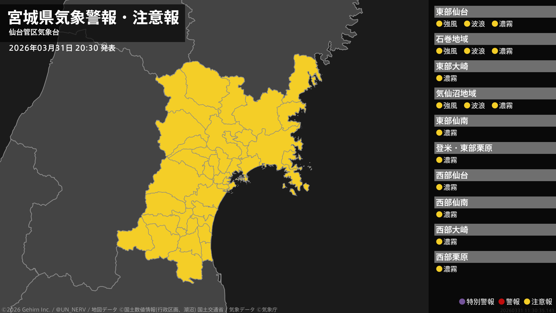 【宮城県 気象警報・注意報 2026年03月31日 20:30】