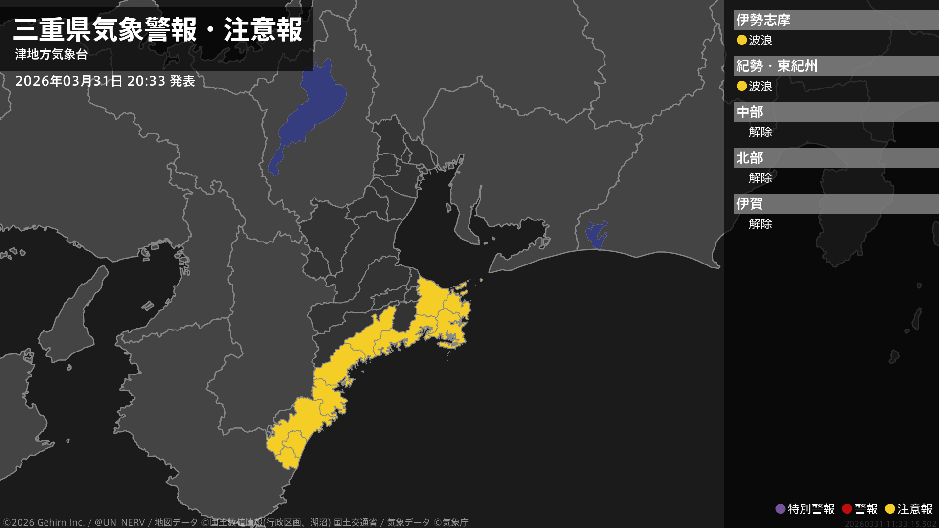 【三重県 気象警報・注意報 2026年03月31日 20:33】