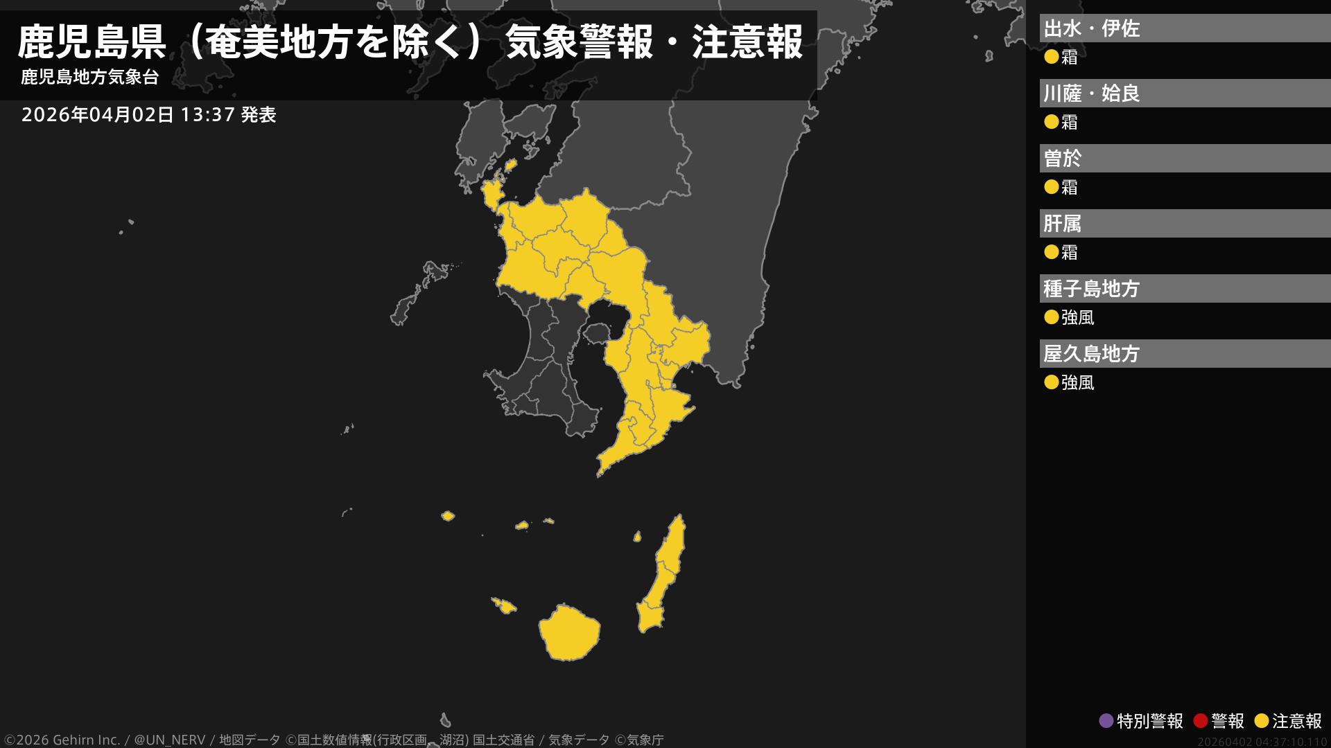 【鹿児島県(奄美地方を除く) 気象警報・注意報 2026年04月02日 13:37】種子島・屋久島地方では、2日夜のはじめ頃まで強風に注意してください。薩摩、大隅地方では、3日朝は霜に対する農作物の管理に注意してください。#気象警報注意報 #鹿児島県(奄美地方除く)