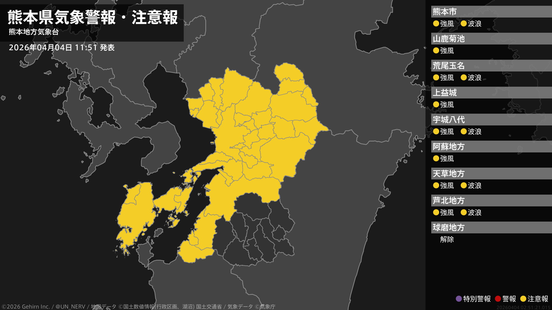 【熊本県 気象警報・注意報 2026年04月04日 11:51】熊本、阿蘇地方では4日夕方まで、天草・芦北地方では4日夜遅くまで、強風に注意してください。熊本地方では4日夕方まで、天草・芦北地方では4日夜遅くまで、高波に注意してください。#気象警報注意報 #熊本県