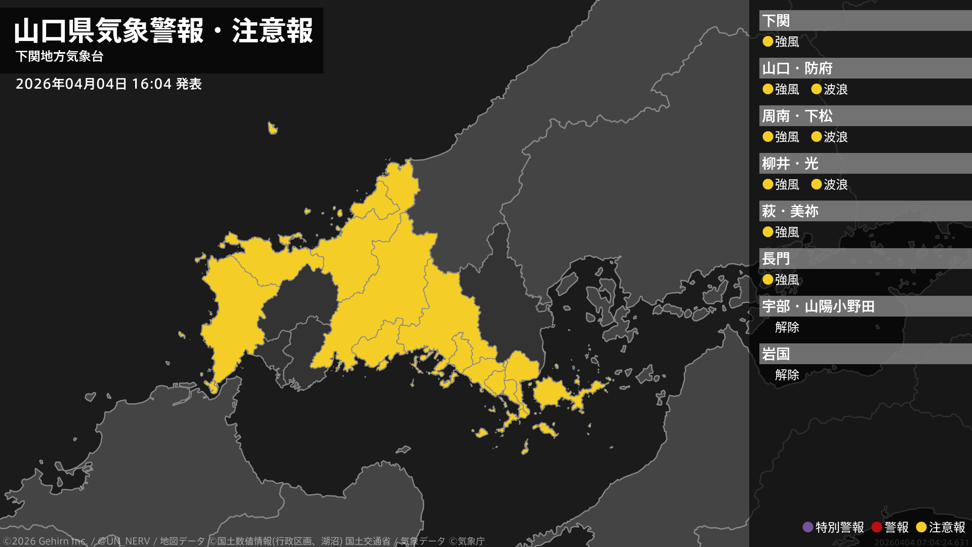 【山口県 気象警報・注意報 2026年04月04日 16:04】