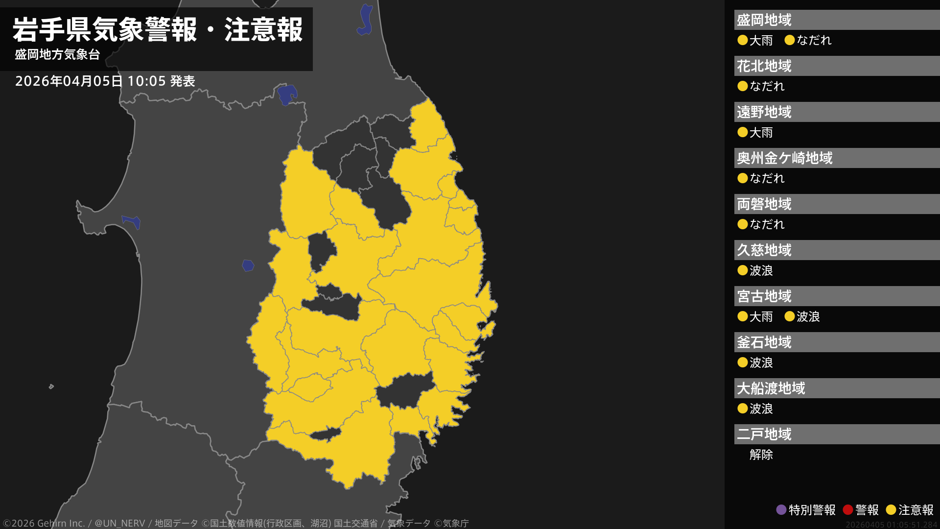 【岩手県 気象警報・注意報 2026年04月05日 10:05】