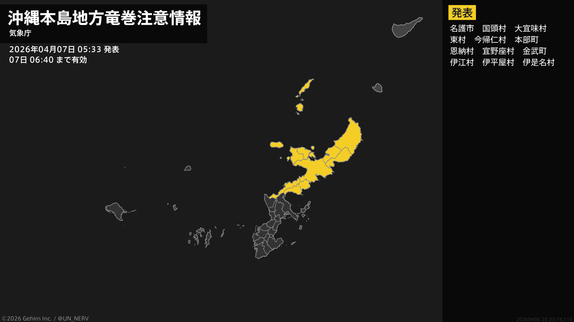 【沖縄本島地方 竜巻注意情報】沖縄本島地方は、竜巻などの激しい突風が発生しやすい気象状況になっています。頑丈な建物内に移動するなど安全確保に努めてください。この情報は07日06:40まで有効です。#竜巻注意情報 #沖縄本島地方