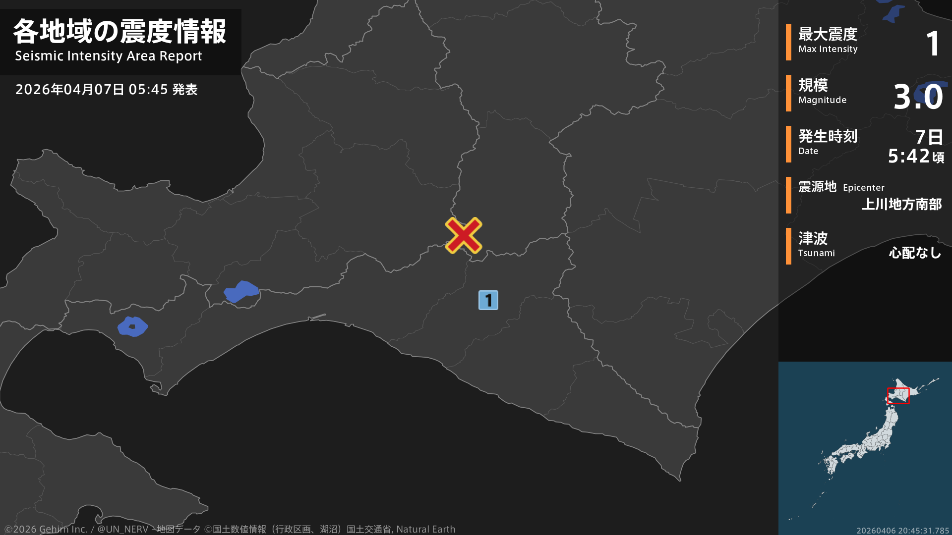 【地震情報 2026年4月7日】5時42分頃、上川地方南部を震源とする地震がありました。震源の深さは約10km、地震の規模はM3.0、最大震度1を北海道で観測しています。この地震による津波の心配はありません。#地震 #北海道