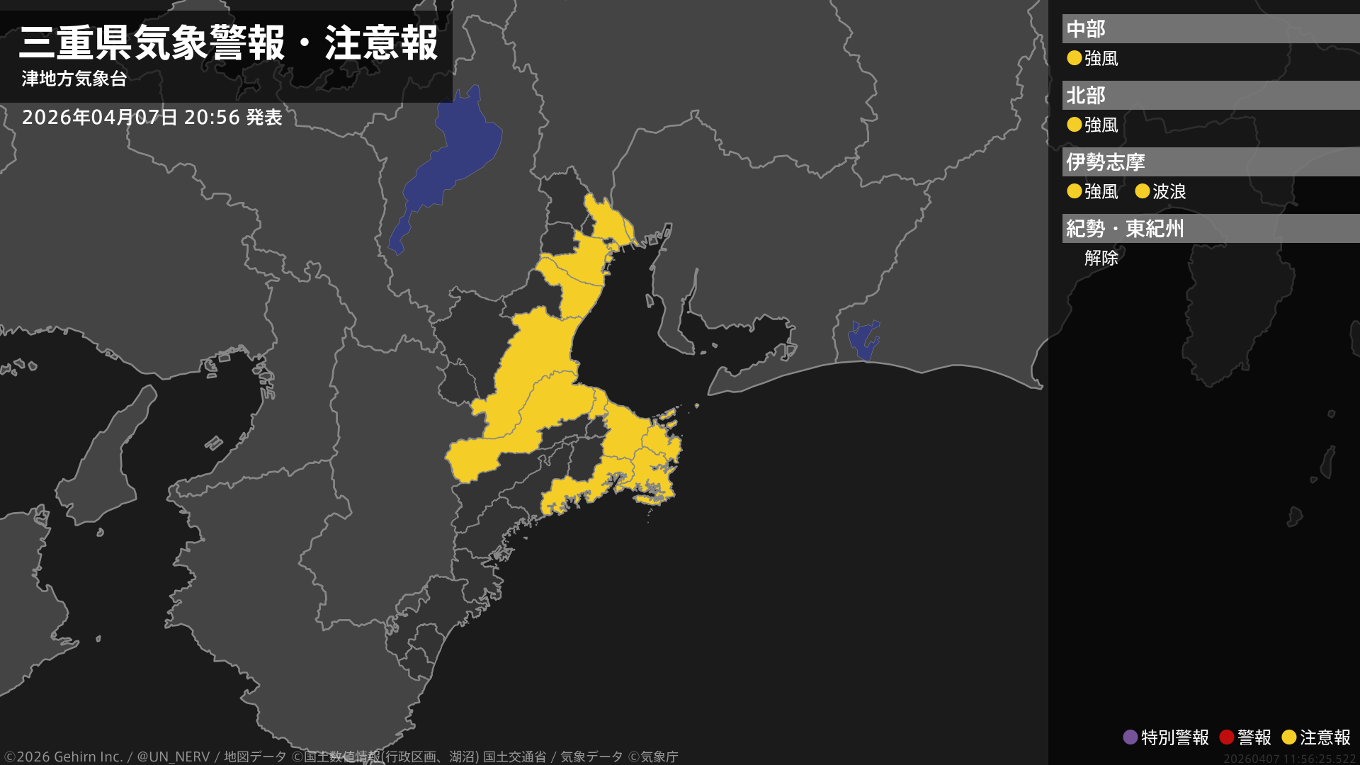【三重県 気象警報・注意報 2026年04月07日 20:56】三重県では、8日明け方まで強風に注意してください。南部では、8日明け方まで高波に注意してください。#気象警報注意報 #三重県