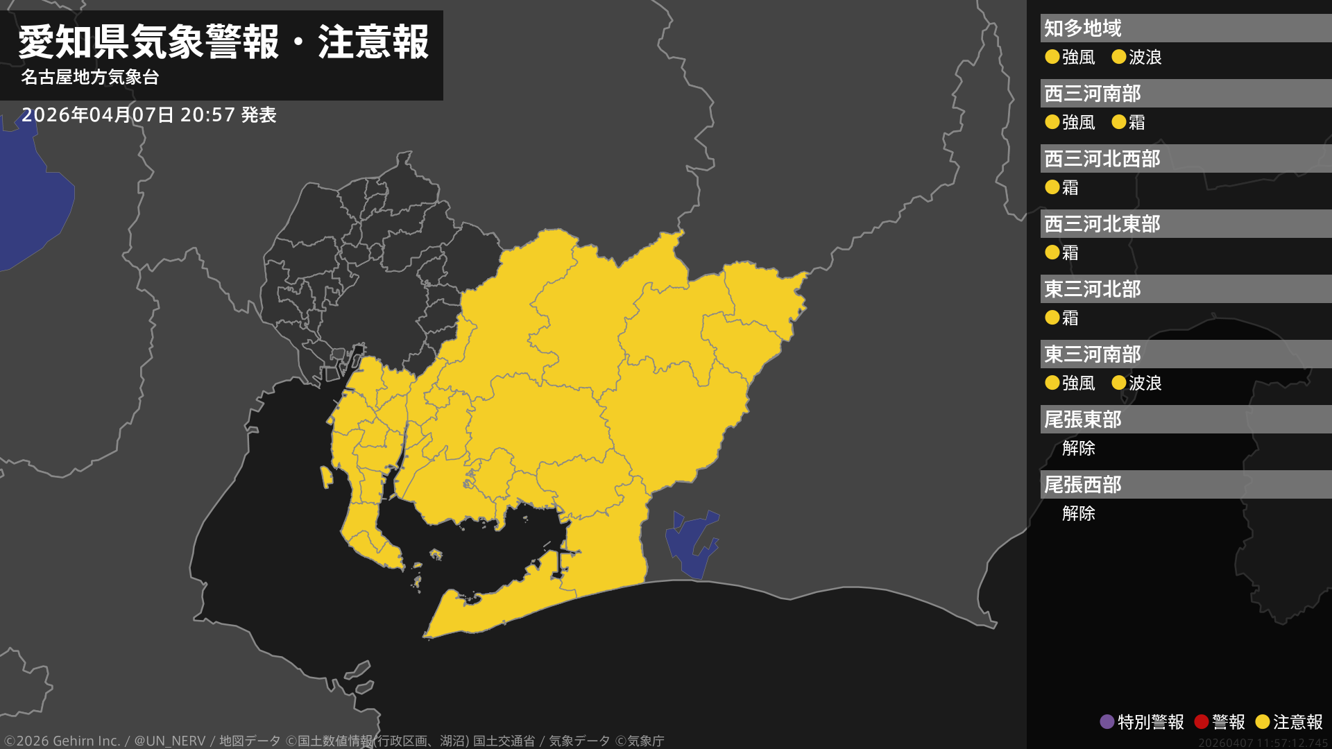 【愛知県 気象警報・注意報 2026年04月07日 20:57】愛知県では、8日明け方まで強風や高波に、8日朝は霜に対する農作物の管理に注意してください。#気象警報注意報 #愛知県