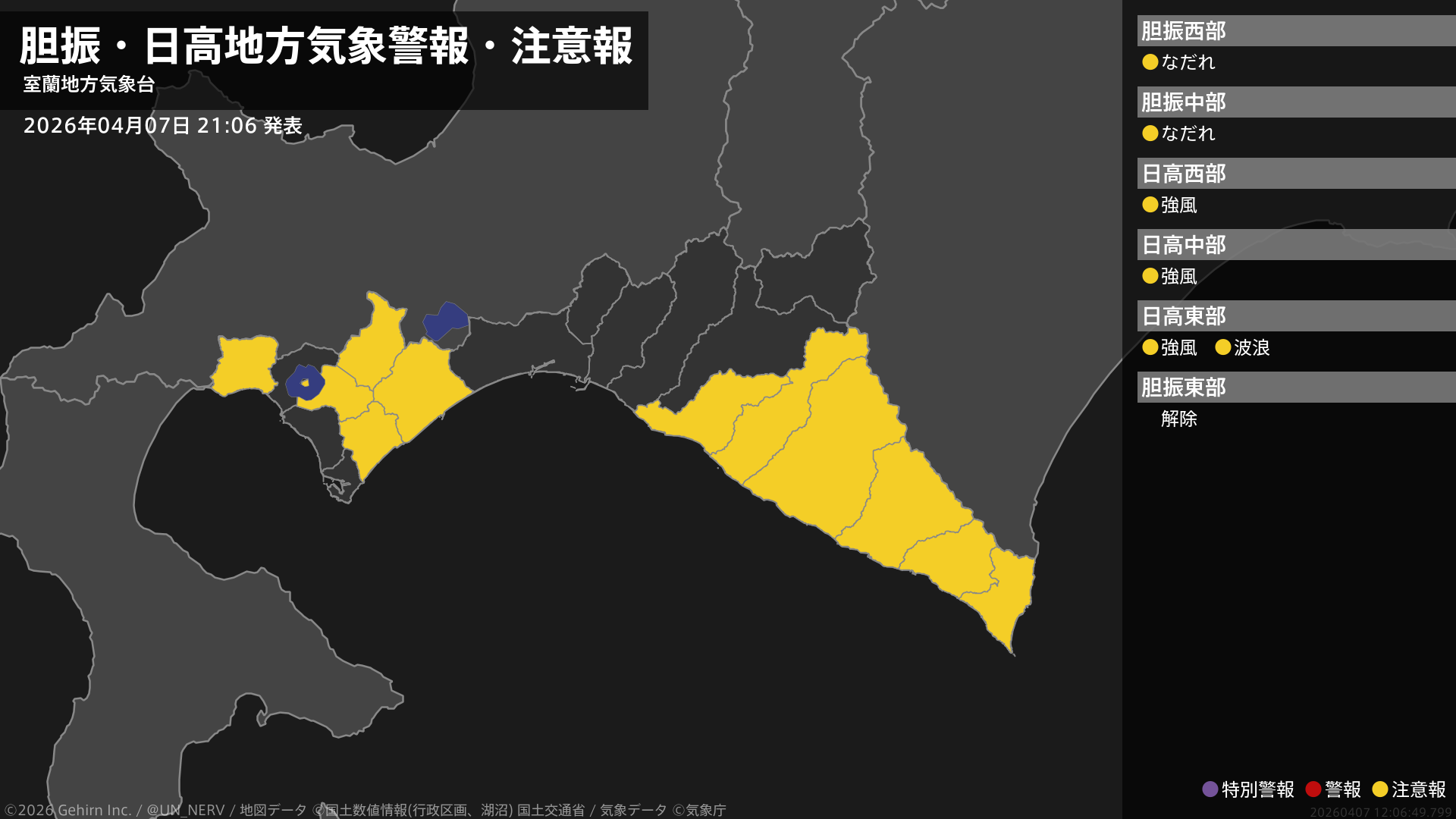 【胆振・日高地方 気象警報・注意報 2026年04月07日 21:06】日高地方では、8日明け方まで強風や高波に注意してください。胆振地方では、8日までなだれに注意してください。#気象警報注意報 #胆振地方 #日高地方