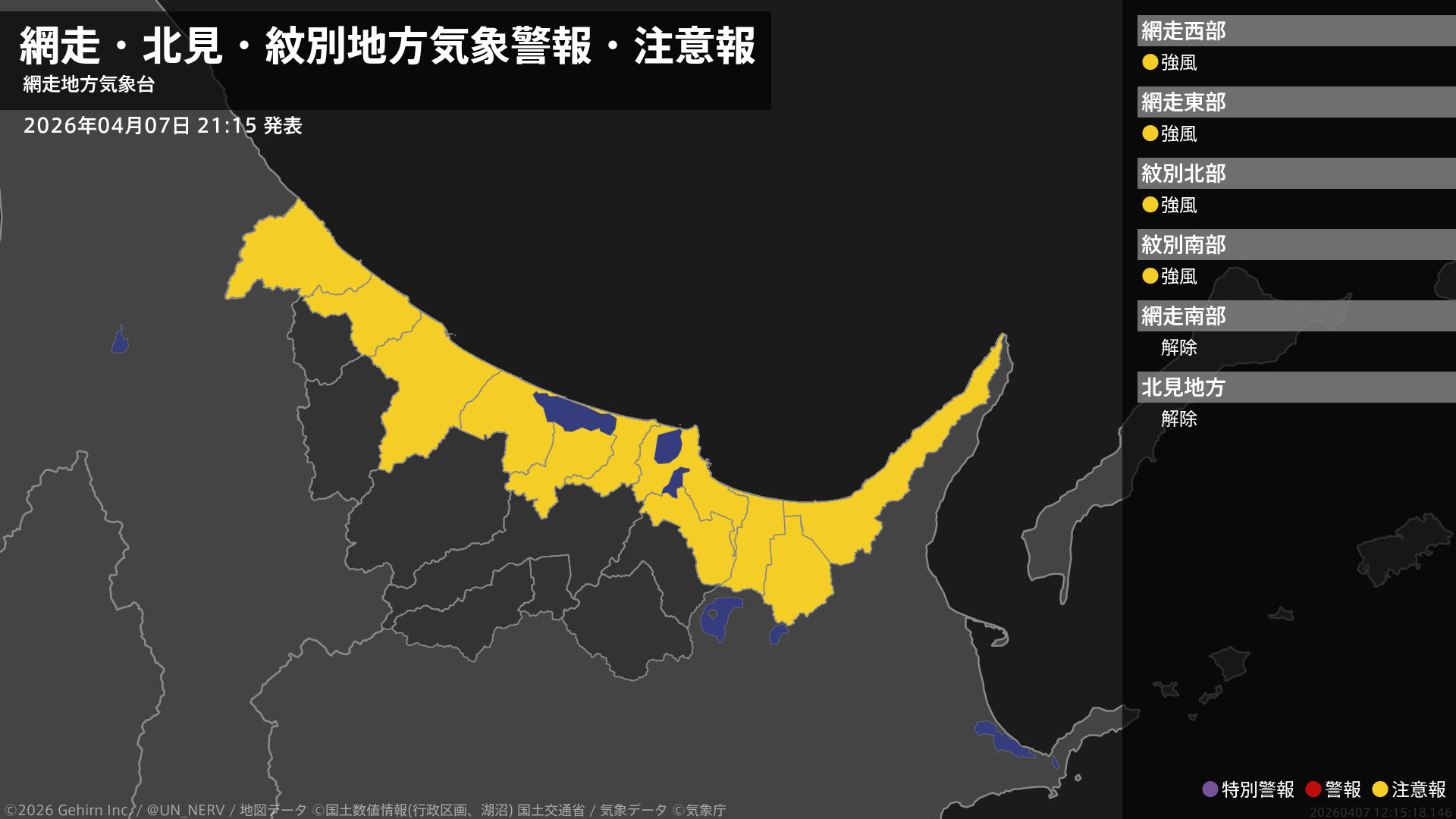【網走・北見・紋別地方 気象警報・注意報 2026年04月07日 21:15】網走、紋別地方では、8日昼前まで強風に注意してください。#気象警報注意報 #網走・北見・紋別地方