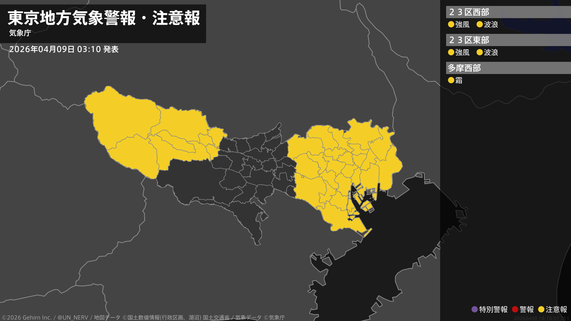 【東京都 気象警報・注意報 2026年04月09日 03:10】東京地方では、9日昼前から強風に、9日朝は霜に対する農作物の管理に注意してください。小笠原諸島では9日朝から9日夕方まで、東京地方では9日昼前から、高波に注意してください。#気象警報注意報 #東京都