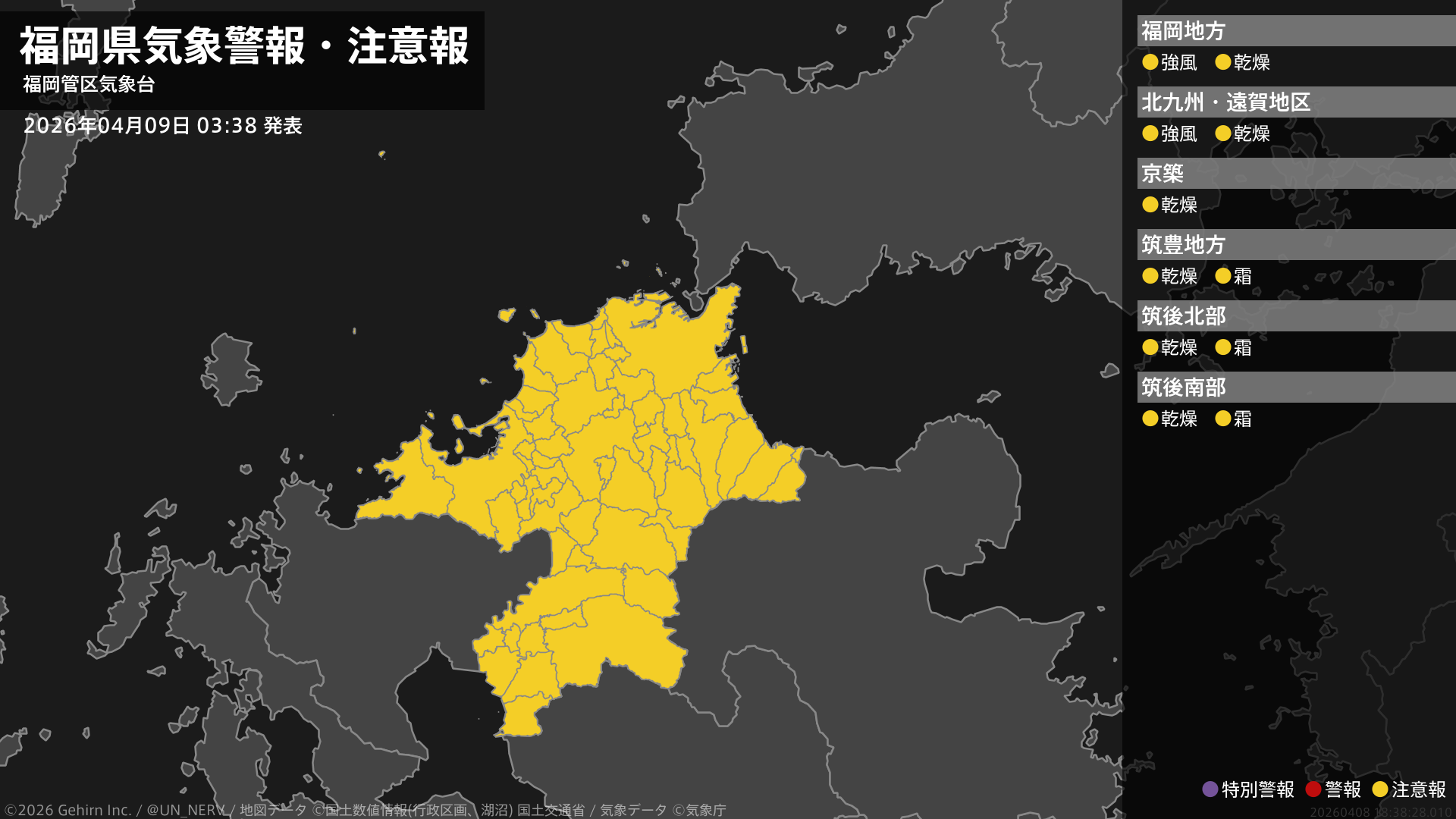 【福岡県 気象警報・注意報 2026年04月09日 03:38】福岡、北九州地方では強風に、福岡県では空気の乾燥した状態が続くため、火の取り扱いに、筑豊、筑後地方では霜に対する農作物の管理に注意してください。#気象警報注意報 #福岡県