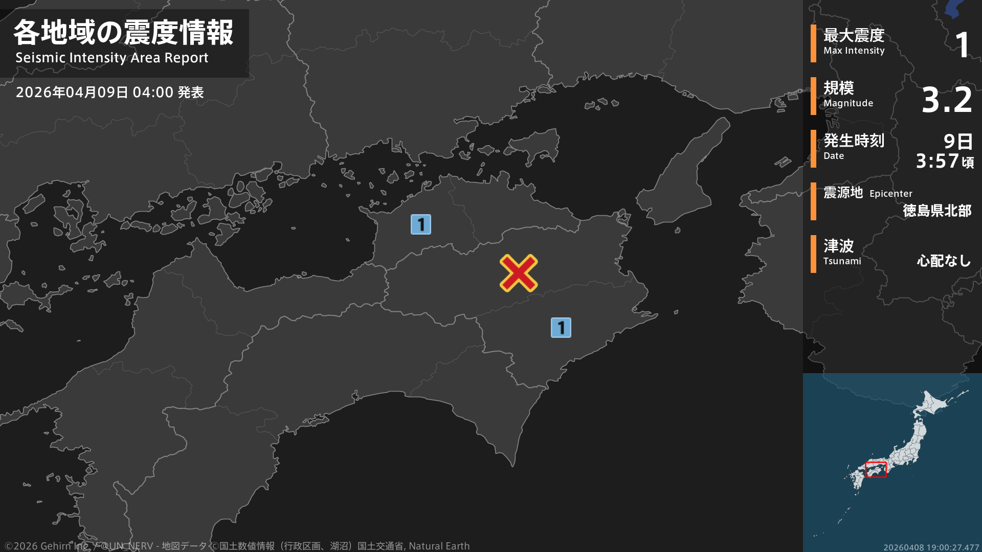 【地震情報 2026年4月9日】3時57分頃、徳島県北部を震源とする地震がありました。震源の深さは約50km、地震の規模はM3.2、最大震度1を徳島県、香川県で観測しています。この地震による津波の心配はありません。#地震 #徳島県 #香川県