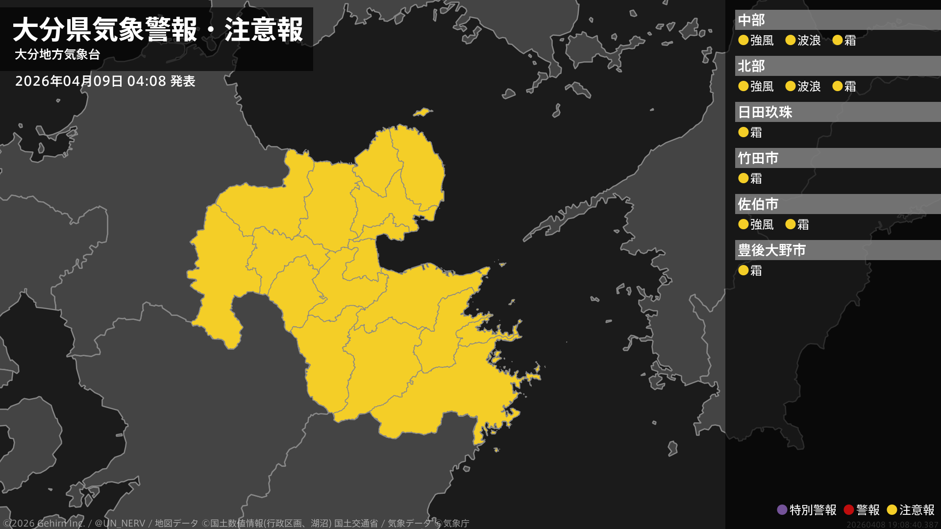 【大分県 気象警報・注意報 2026年04月09日 04:08】中部、北部、南部では、9日昼前から強風に注意してください。中部、北部では、9日昼前から高波に注意してください。大分県では、9日朝は霜に対する農作物の管理に注意してください。#気象警報注意報 #大分県