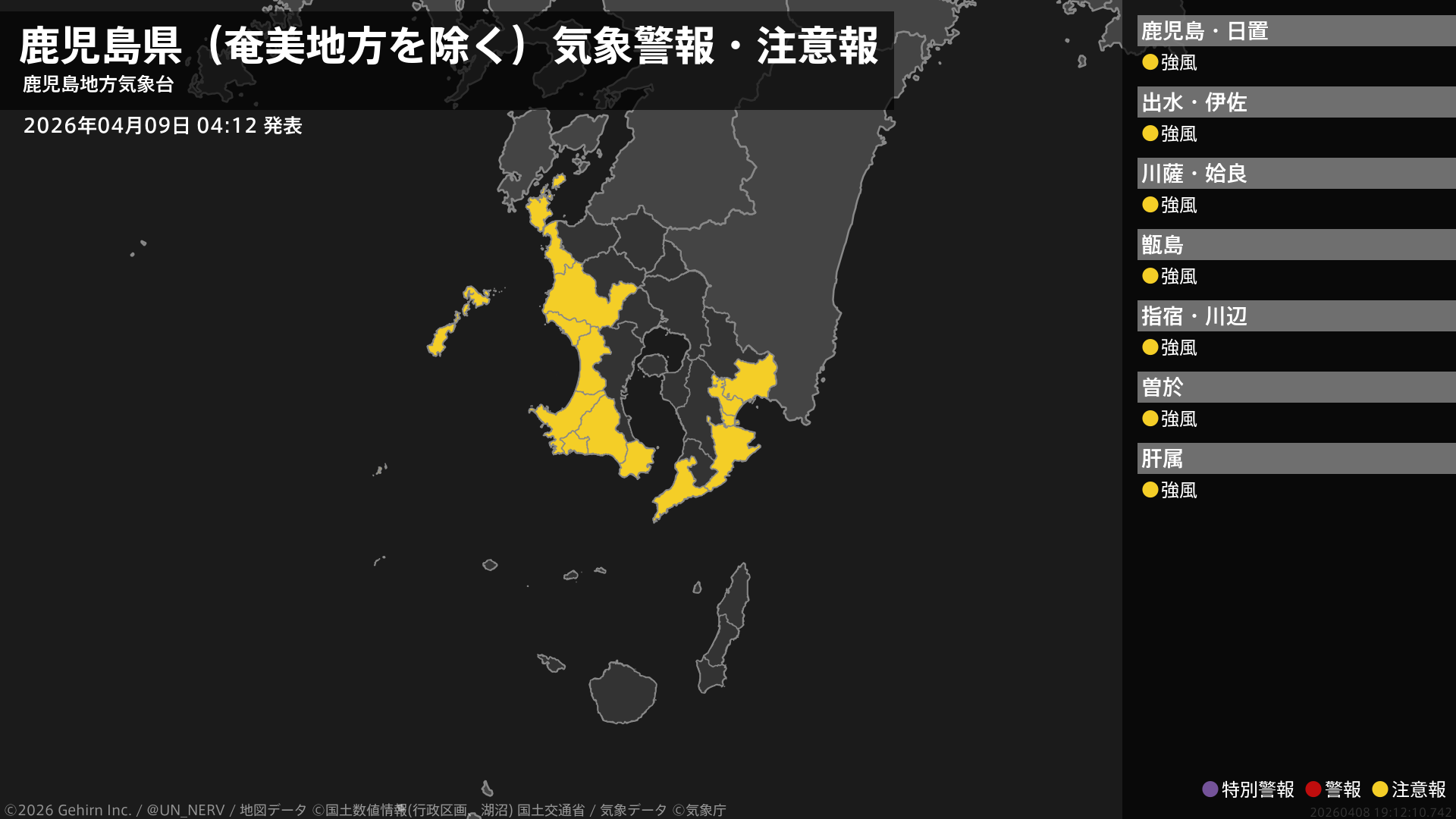 【鹿児島県(奄美地方を除く) 気象警報・注意報 2026年04月09日 04:12】薩摩地方では9日朝から、大隅地方では9日昼前から、強風に注意してください。#気象警報注意報 #鹿児島県(奄美地方除く)