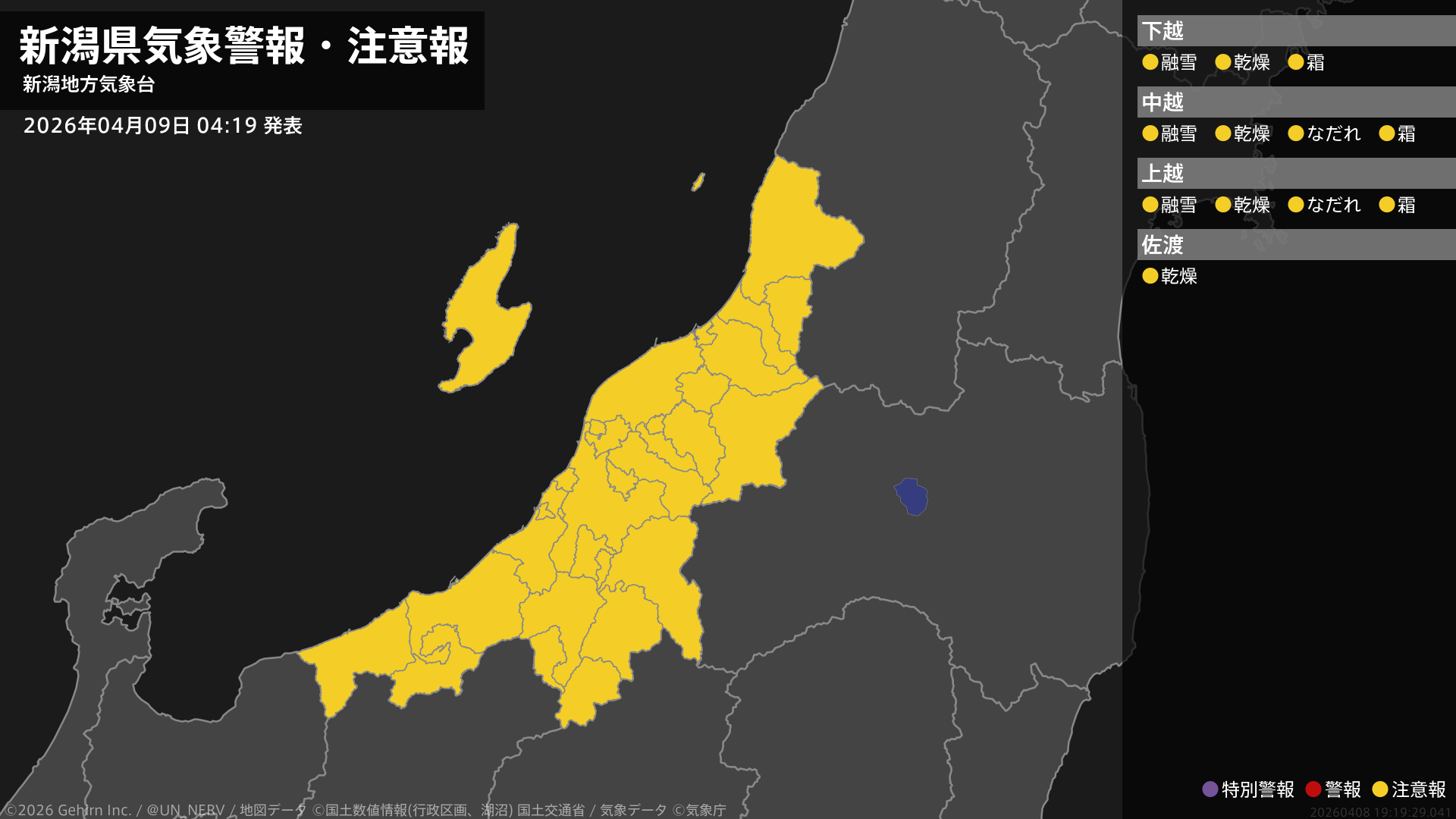 【新潟県 気象警報・注意報 2026年04月09日 04:19】下越、中越、上越では融雪による土砂災害や霜に対する農作物の管理に、新潟県では空気の乾燥した状態が続くため、火の取り扱いに、中越、上越ではなだれに注意してください。#気象警報注意報 #新潟県