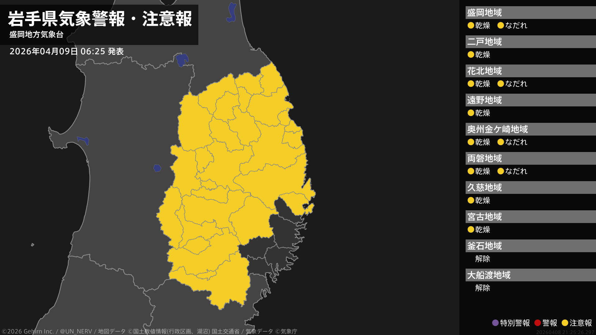【岩手県 気象警報・注意報 2026年04月09日 06:25】内陸、沿岸北部では、9日まで空気の乾燥した状態が続くため、火の取り扱いに注意してください。内陸では、ここしばらくなだれに注意してください。#気象警報注意報 #岩手県